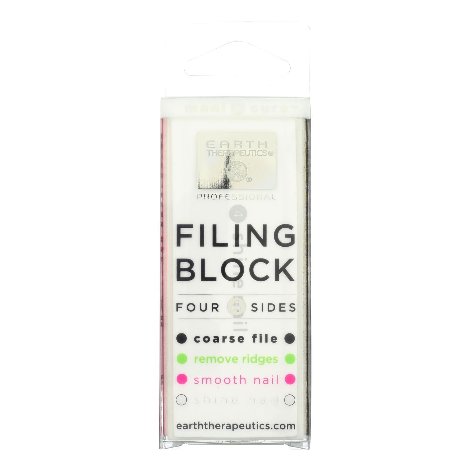 EARTH THERAPEUTICS FILING BLOCK IS A FOUR-SIDED MANICURE BLOCK. WITH A COARSE SIDE FOR FILING DOWN NAILS, A SMOOTHING SIDE TO REFINE NAILS, A SIDE TO REMOVE RIDGES AND A SIDE TO SHINE AND POLISH, THIS FILING BLOCK IS PERFECT FOR ANY AT-HOME NAIL CARE REGIME. THIS COLOR-CODED FILING BLOCK MAKES IT EASY TO GET FANTASTIC NAILS. EACH PACKAGE OF EARTH THERAPEUTICS FILING BLOCK CONTAINS ONE BLOCK.