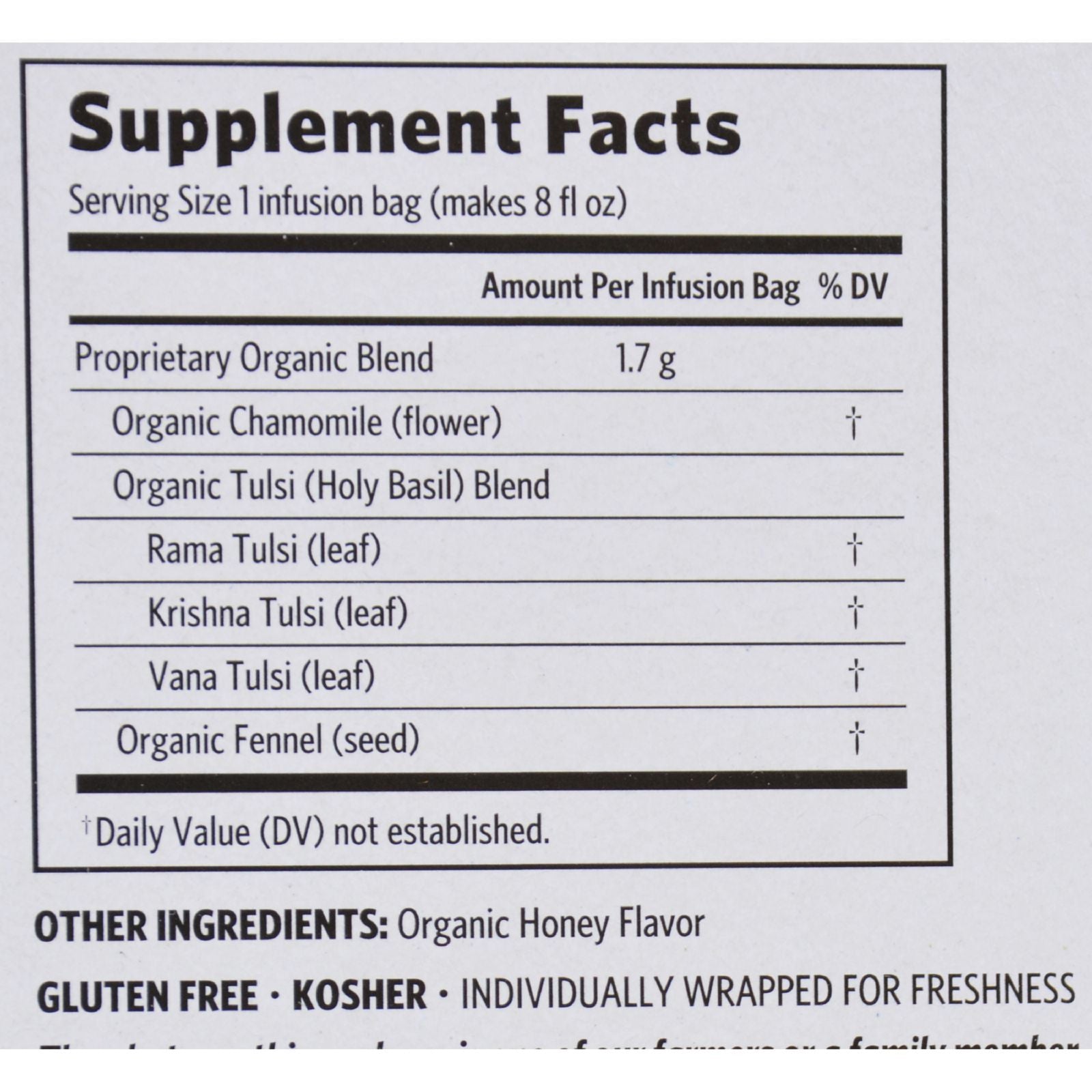 - Ingredients: Proprietary Organic Blend: Organic Chamomile (Flower), Organic Tulsi (Holy Basil) Blend: Holy Basil (Ocimum Sanctum) (Krishna & Rama Varieties) (Leaf), East India Basil (Ocimum Gratissimum) (Vana Variety) (Leaf). Other Ingredients: Organic Honey Flavor.