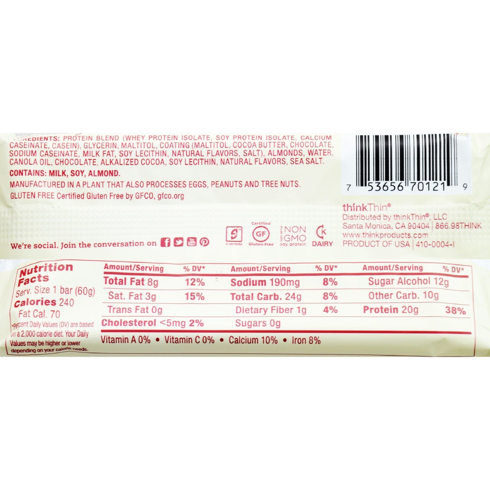 THINKTHIN HIGH PROTEIN CHOCOLATE FUDGE BARS CONTAIN NO SUGARS OR SWEETENERS AND ARE A VERIFIED LOW GLYCEMIC INDEX SNACK. EVERY 2.1 OZ. CHOCOLATE FUDGE BAR IS FREE OF GLUTEN AND TRANS FAT AND CONTAINS 20 GRAMS OF PROTEIN. ALL THINKTHIN HIGH PROTEIN BARS ARE KOSHER AND 100% NON-GMO VERIFIED. SEE NUTRITION FACTS PANEL FOR ALLERGENS.