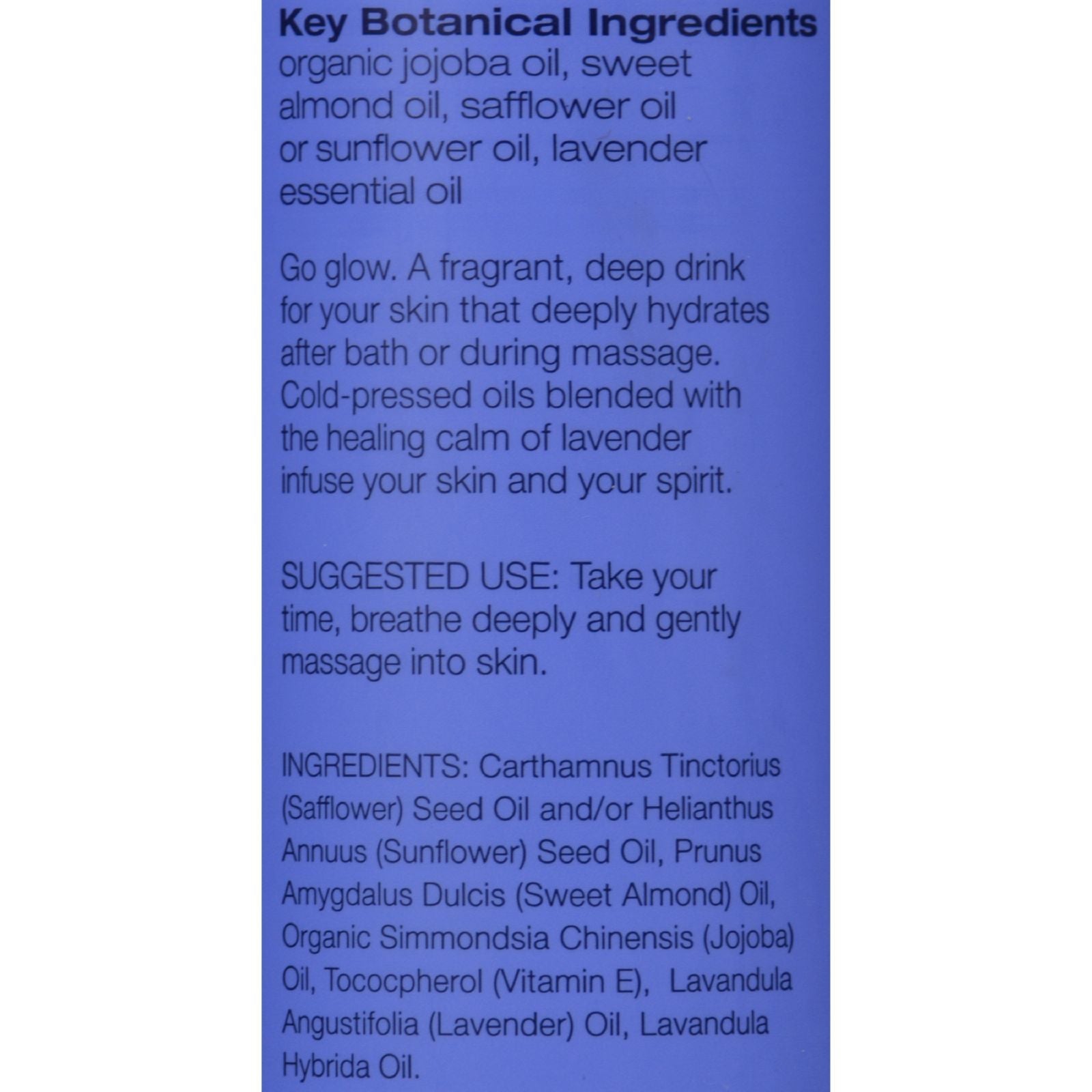 - Ingredients: CARTHAMUS TINCTORIUS (SAFFLOWER) SEED OIL;PRUNUS AMYGDALUS DULCIS (SWEET ALMOND) OIL;ORGANIC SIMMONDSIA CHINENSIS (JOJOBA) OIL;TOCOPHEROL (VITAMIN E);LAVANDULA ANGUSTIFOLIA (LAVENDER) OIL;LAVANDULA HYBRIDA OIL