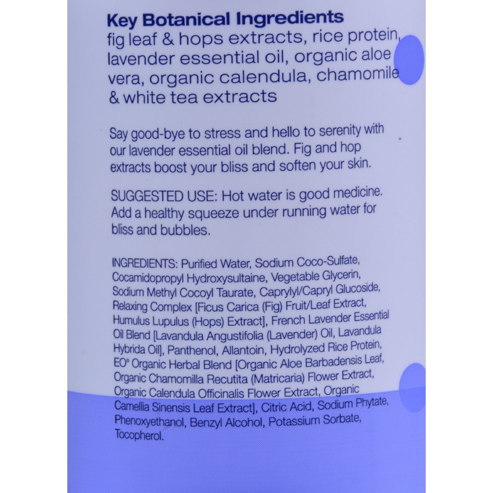 - Ingredients: PURIFIED WATER;SODIUM COCO-SULFATE;COCAMIDOPROPYL HYDROXYSULTAINE;GLYCERIN;SODIUM METHYL COCOYL TAURATE;CAPRYLYL/CAPRYL GLUCOSIDE;RELAXING COMPLEX [FICUS CARICA;FIG;FRUIT/LEAF EXTRACT;HUMULUS LUPULUS;HOPS;EXTRACT];FRENCH LAVENDER ESSENTIAL OIL BLEND [LAVANDULA ANGUSTIFOLIA;LAVENDER;OIL;LAVANDULA HYBRIDA OIL];PANTHENOL;ALLANTOIN;HYDROLYZED RICE PROTEIN;EO® ORGANIC HERBAL BLEND [ORGANIC ALOE BARBADENSIS LEAF;ORGANIC CHAMOMILLA RECUTITA;MATRICARIA;FLOWER EXTRACT;ORGANIC CALENDULA OFFICINALIS FLOWER