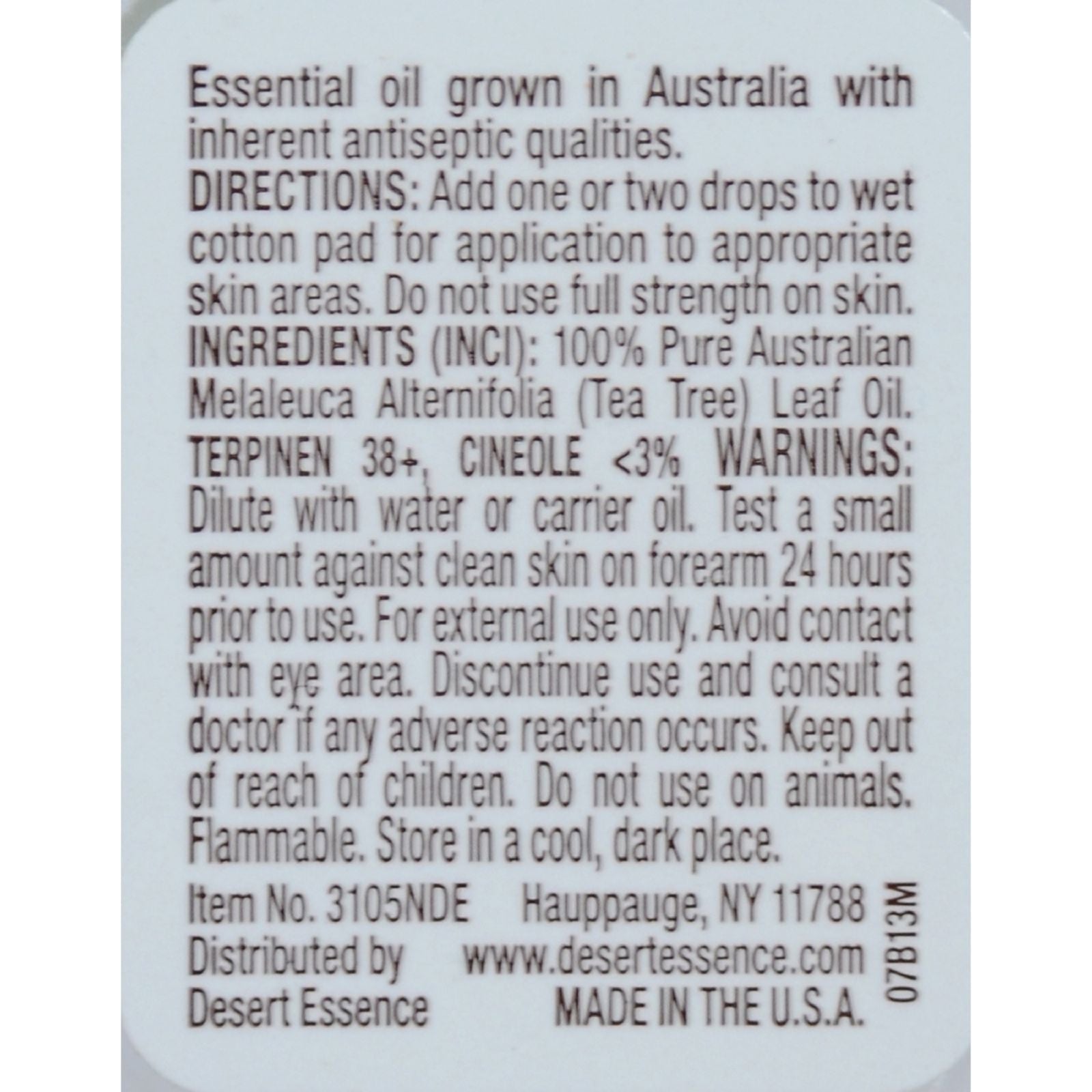 DESERT ESSENCE 100% AUSTRALIAN TEA TREE OIL IS A TOPICAL SOLUTION TO EASE PAIN FROM ACNE, INFECTIONS AND OTHER SKIN ISSUES. MADE WITH ABSOLUTELY NOTHING BUT 100% AUSTRALIAN TEA TREE OIL, OUR PURE FORMULA IS A NATURAL SOLUTION TO THE ISSUE OF SKIN TREATMENT. INCLUDED IS ONE 0.5 OZ. CONTAINER OF DESERT ESSENCE 100% AUSTRALIAN TEA TREE OIL.