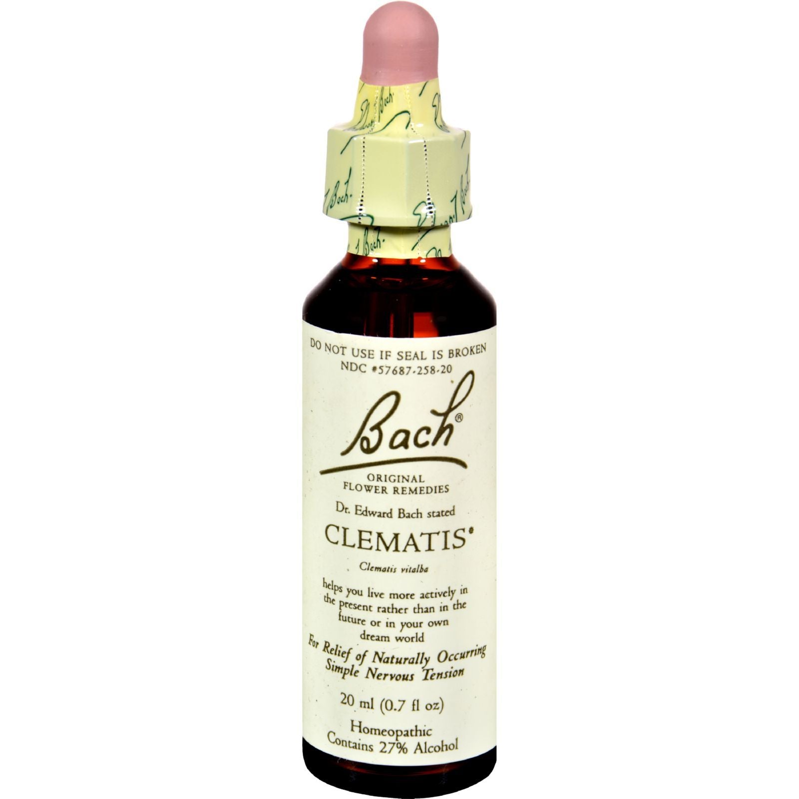 BACK ORIGINAL FLOWER REMEDIES CLEMATIS TINCTURE CONTAINS A 5X DILUTION OF CLEMATIS THAT HELPS RELIEVE EVERYDAY TENSION. MIX TWO DROPS OF THIS TINCTURE IN WATER OR TAKE IT ALONE BY MOUTH AS NEEDED TO RESTORE YOUR MENTAL BALANCE. THIS TINCTURE COMES IN A SAFETY-SEALED DROPPER BOTTLE FOR EASY DOSING. EACH BOTTLE CONTAINS 0.7 FL. OZ. OF CLEMATIS TINCTURE.