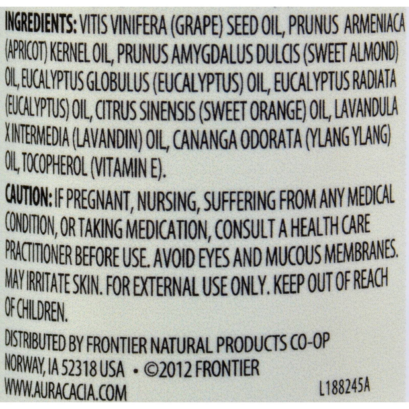 AURA CACIA CLEARING EUCALYPTUS AROMATHERAPY BODY OIL IS A CRAFTED BLEND OF 100% PURE PLANT-DERIVED OILS THAT NOURISH THE SKIN. THIS PETROLEUM-FREE OIL CONTAINS THREE MAIN SCENTS: EUCALYPTUS FOR INVIGORATING, SWEET ORANGE FOR UPLIFTING AND LAVANDIN FOR PURIFYING. WITH NO SYNTHETIC INGREDIENTS OR PARABENS, CREATE AN AT-HOME SPA TREATMENT THAT FULFILLS THE SENSES, PROTECTS THE BODY AND LIFTS THE SPIRIT. EACH BOTTLE OF AURA CACIA CLEARING EUCALYPTUS AROMATHERAPY BODY OIL CONTAINS 4 FL. OZ. OF PURE ESSENTIAL OILS. SEE LABEL FOR WARNINGS.
