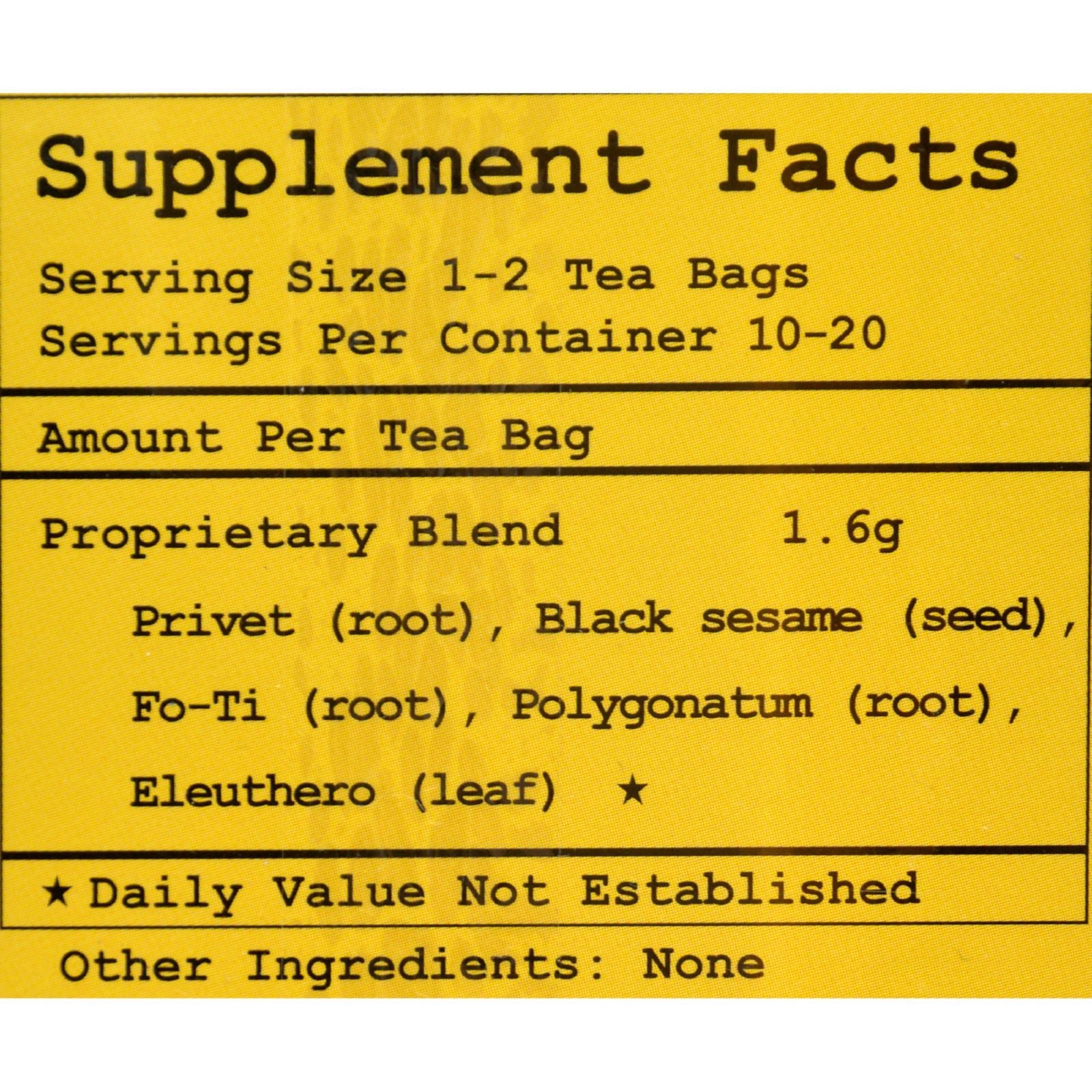 Health King Hair Regeneration Herb Tea Description: Caffeine Free 100% Natural The Way to Great Hair Hair Regeneration Herb Tea is made of wild privet, flowery knotweed (he shou wu), eleuthero, black sesame and Solomon seal. Chinese medicine uses their blood circulation promoting, internal secretion regulating, liver and kidney nurturing, bacteria and fungus inhibiting properties to maintain healthy hair growth and to fend off premature grey hair. Free Of Caffeine. Disclaimer These statements have not been evaluated by the FDA. These products are not intended to diagnose, treat, cure, or prevent any disease.