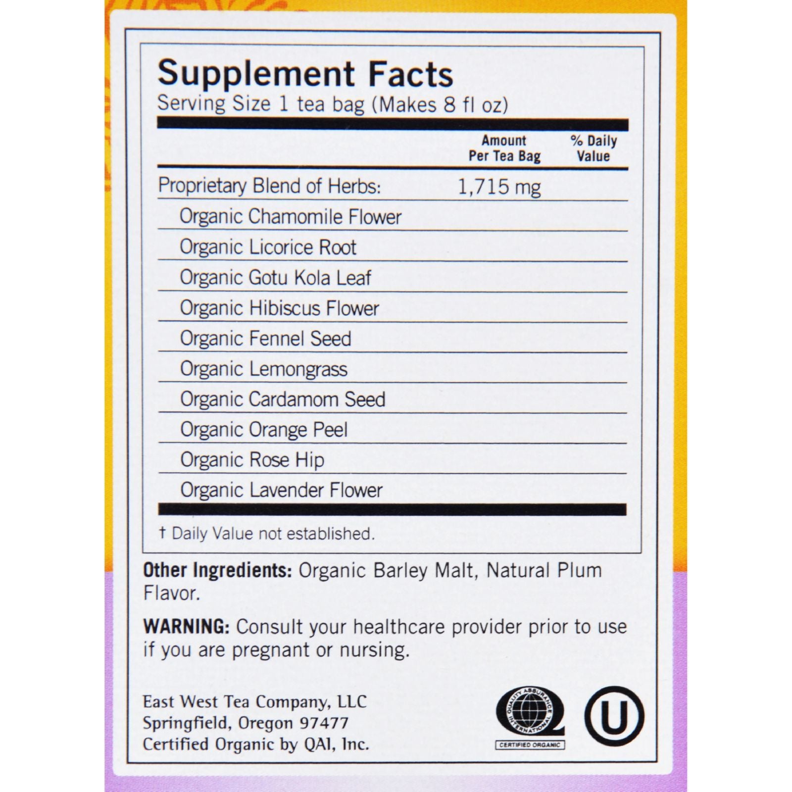 - Ingredients: Proprietary Blend of Herbs: Organic Chamomile Flower, Organic Licorice Root, Organic Gotu Kola Leaf, Organic Hibiscus Flower, Organic Fennel Seed, Organic Cardamom Pod, Organic Lemongrass, Organic Orange Peel, Organic Rose Hip, Organic Lavender Flower. Other Ingredients: Organic Toasted Brown Rice, Organic Plum Flavor, Organic Brown Rice Flavor.