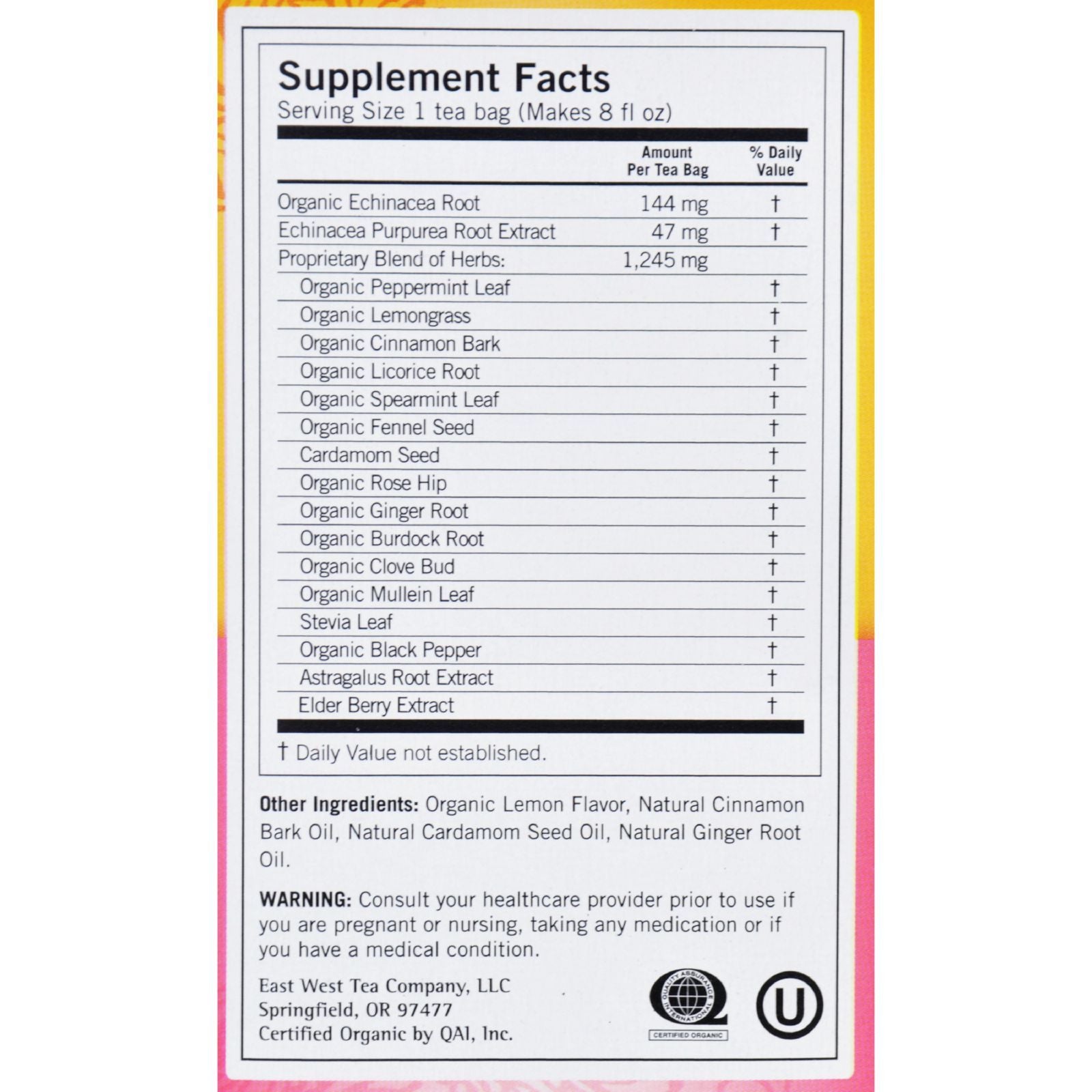 - Ingredients: Proprietary Blend of Herbs: Organic Peppermint Leaf, Organic Lemongrass, Organic Cinnamon Bark, Organic Licorice Bark, Organic Spearmint Leaf, Organic Fennel Seed, Organic Cardamom Pod, Organic Rose Hip, Organic Ginger Root, Organic Burdock Root, Organic Mullein Leaf, Organic Clove Bud, Organic Stevia Leaf, Organic Black Pepper, Organic Black Elderberry Extract. Other Ingredients: Organic Lemon Flavor, Organic Cinnamon Bark Oil, Organic Cardamom Seed Oil, Organic Ginger Root Oil.