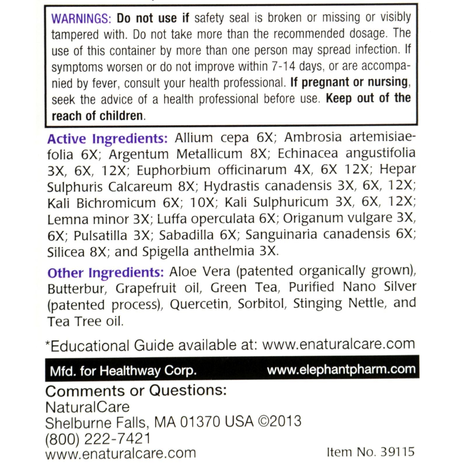 - Ingredients: ALLIUM CEPA 6X; AMBROSIA ARTEMISIAEFOLIA 6X; ARGENTUM METALLICUM 8X; ECHINACEA ANGUSTIFOLIA 3X;6X;12X; EUPHORBIUM OFFICINARUM 4X;6X 12X; HEPAR SULPHURIS CALCAREUM 8X; HYDRASTIS CANADENSIS 3X;12X; KALI BICHROMICUM 6X; 10X; KALI SULPHURICUM 3X;12X; LEMNA MINOR 3X; LUFFA OPERCULATA 6X; ORIGANUM VULGARE 3X;6X; PULSATILLA 3X; SABADILLA 6X; SANGUINARIA CANADENSIS 6X; SILICEA 8X; AND SPIGELLA ANTHELMIA 3X;ALOE VERA;PATENTED ORGANICALLY GROWN;BUTTERBUR;GRAPEFRUIT OIL;GREEN TEA;PURIFIED NANO SILVER;PATEN