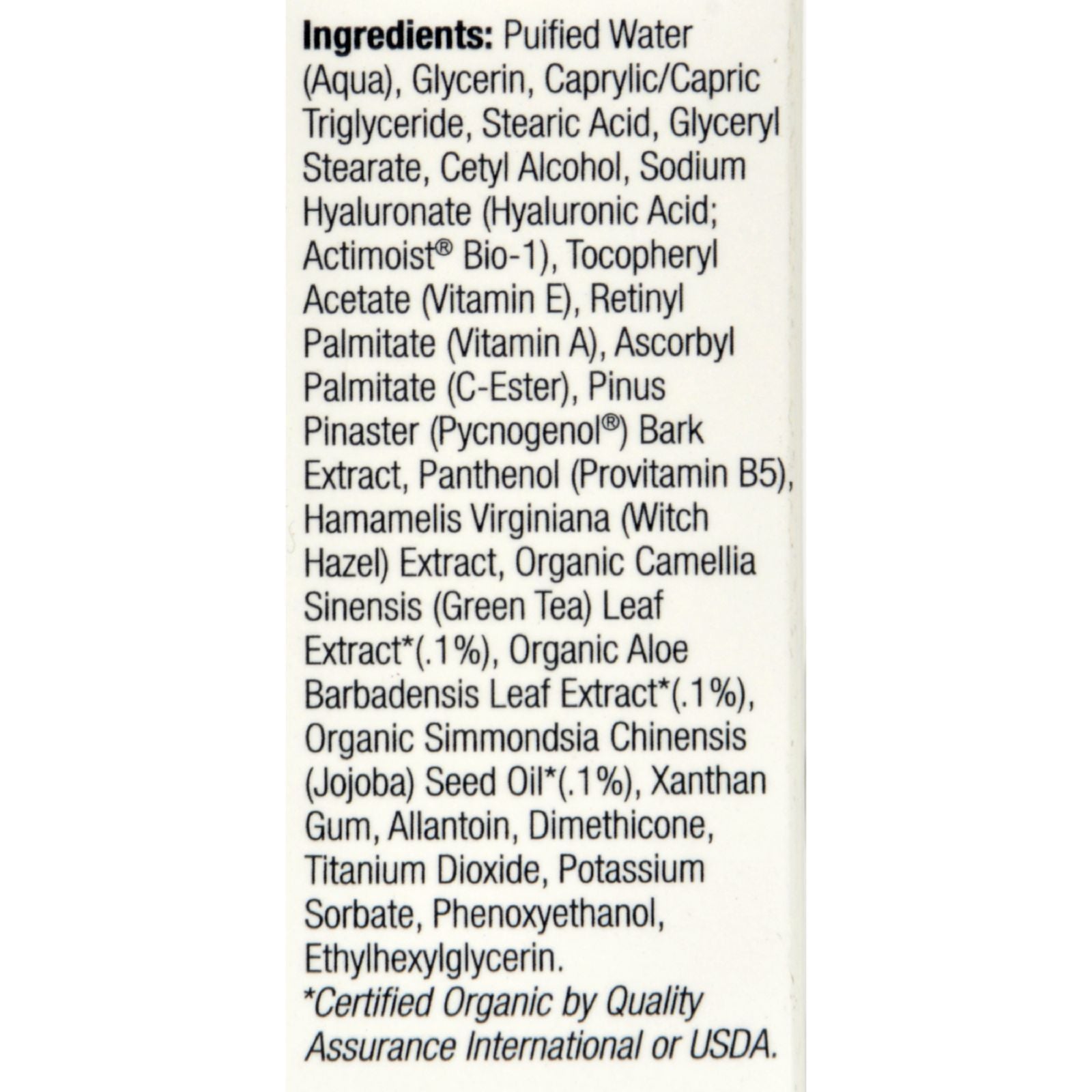 - Ingredients: PURIFIED WATER;CAPRYLIC/CAPRIC TRIGLYCERIDE;PLANT DERIVED;GLYCERIN;VEGETABLE DERIVED;STEARIC ACID;CETYL ALCOHOL;GLYCERYL STEARATE SE;HAMAMELIS VIRGINIANA;WITCH HAZEL;EXTRACT;SODIUM HYALURONATE;HYALURONIC ACID; ACTIMOIST® BIO-1;TOCOPHERYL ACETATE;VITAMIN E;RETINYL PALMITATE;VITAMIN A;ASCORBYL PALMITATE;VITAMIN C ESTER;PINUS PINASTER;PYCNOGENOL®;BARK EXTRACT;PANTHENOL;PROVITAMIN B5;ORGANIC CAMELIA SINENSIS;GREEN TEA;LEAF EXTRACT;ORGANIC ALOE BARBADENSIS;ALOE VERA;GEL EXTRACT;ORGANIC SIMMONDSIA CHI