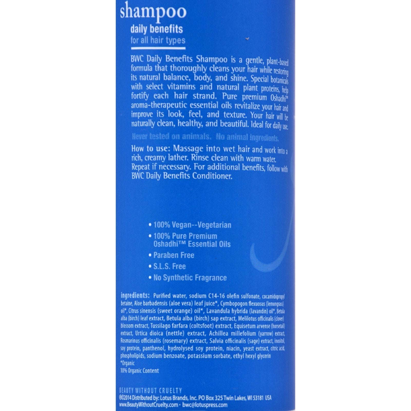 BWC Daily Benefits Shampoo is a gentle, plant-based formula that thoroughly cleans your hair while restoring its natural balance, body, and shine. Special botanicals with select vitamins and natural plant proteins, help fortify and nourish each hair strand. Pure premium aroma-therapeutic essential oils strengthen and protect your hair and improve its look, feel, and texture. Your hair will be naturally clean, healthy, and beautiful. Ideal for daily use.