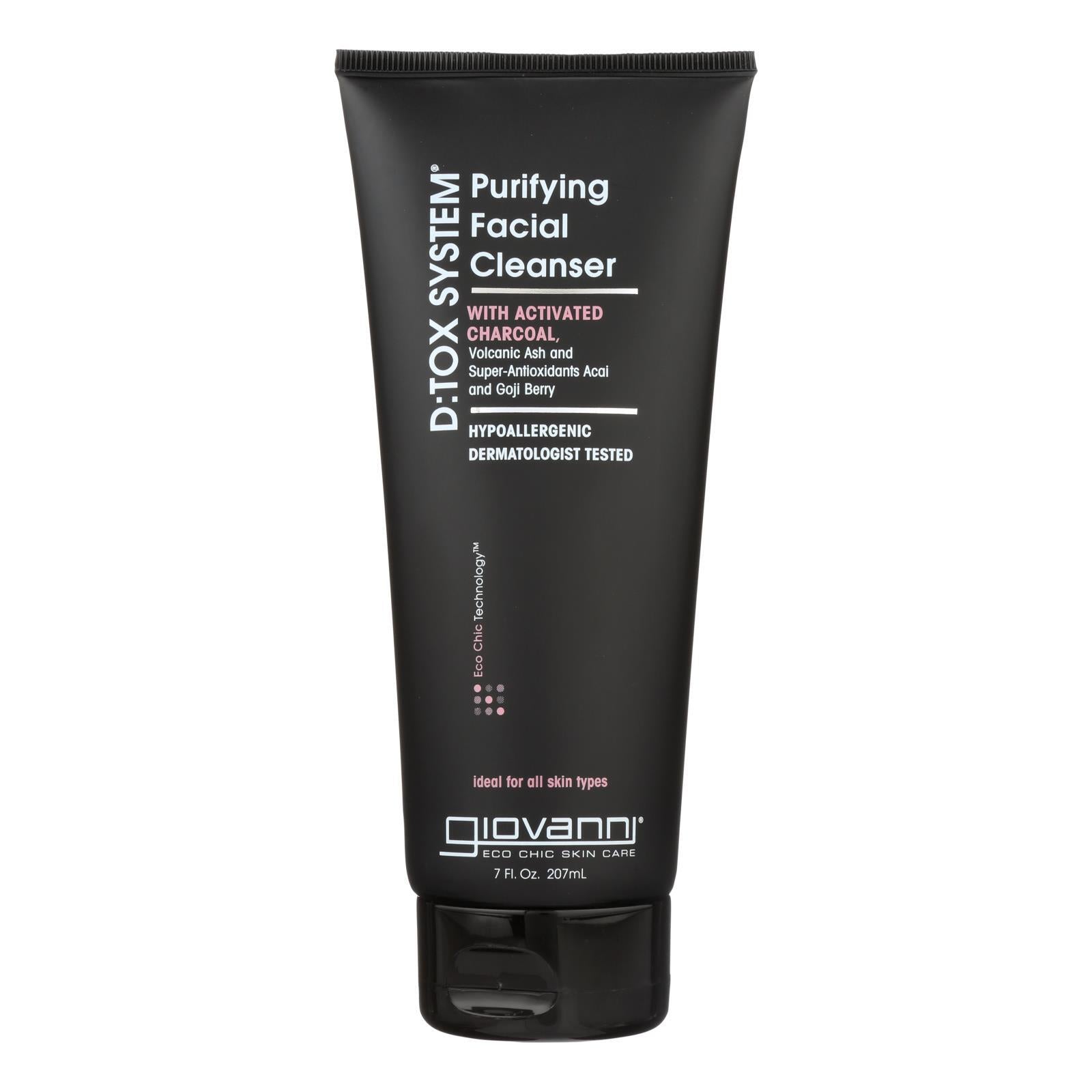 GIOVANNI, FACIAL CLEANSER D:TOX SYSTEM PURIFYING FACIAL CLEANSER (STEP 1) IS A VEGETARIAN, DERMATOLOGIST TESTED, HYPOALLERGENIC CLEANSER DESIGNED TO HELP YOUR SKIN BE PURE AND DETOXIFIED. ACTIVATED CHARCOAL AND VOLCANIC ASH DISLODGE AND ABSORB POLLUTANTS AND EXTRACT IMPURITIES. SUPER-ANTIOXIDANTS LIKE ACAI AND GOJI BERRY WILL LEAVE YOUR SKIN REFRESHED AND HYDRATED. EACH TUBE CONTAINS 7. FL. OZ. OF CLEANSER.