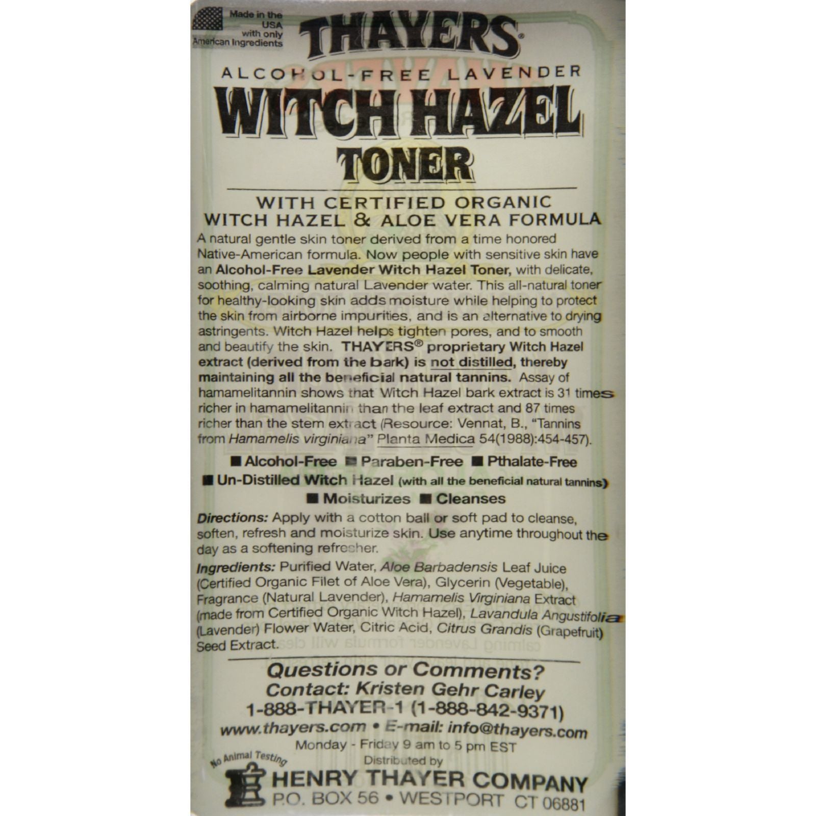 Aloe vera formula. Since 1847. Natural remedies. Your skin will think you're at a spa. Thayers Alcohol-Free Lavender Witch Hazel with Aloe Vera will make your skin bloom. This natural gentle, skin toner is derived from a time-honored Native American formula. Thayers developed this natural toner for healthy-looking skin, adding moisture while helping to protect skin from airborne impurities, and as an alternative to drying astringents. Thayers grown exclusively for Thayers on family farm in Fairfield County, Connecticut. Our unique blend includes filet of Aloe Vera to dehydrate skin and Witch Hazel to tighten pores and smooth skin without drying. Thayers proprietary Witch Hazel is not distilled, thereby maintaining all the beneficial, natural tannins. Alcohol-free. Paraben-free. Phthalate-free. Gluten-free. Rose water. Cleanses. Tones. Cruelty free. The carefully selected, naturally sourced ingredients in this product may have undergone limited processing. Questions or comments? 1-888-Thayer-1. 1-888-842-9371. www.thayers.com. Monday - Friday 8 am to 4 pm EST. Made in USA.