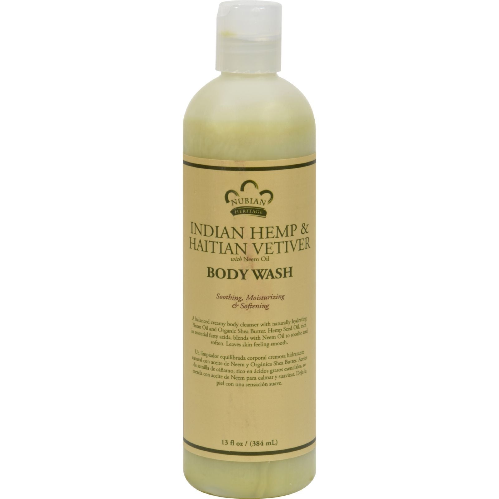 NUBIAN HERITAGE INDIAN HEMP & HAITIAN VETIVER BODY WASH IS AN AROMATIC CREAMY BODY WASH THAT CLEANSES WITH NATURALLY HYDRATING NEEM OIL AND SHEA BUTTER. NOURISHING ESSENTIAL FATTY ACIDS FROM HEMP SEED OIL AND HAITIAN VETIVER SOOTHE WHILE LEAVING SKIN FEELING SMOOTH. THIS BODY WASH USES ETHICALLY TRADED INGREDIENTS, IS SUSTAINABLY PRODUCED, DOESN'T USE ANIMAL TESTING AND COMES IN A 13 FL. OZ. BOTTLE.