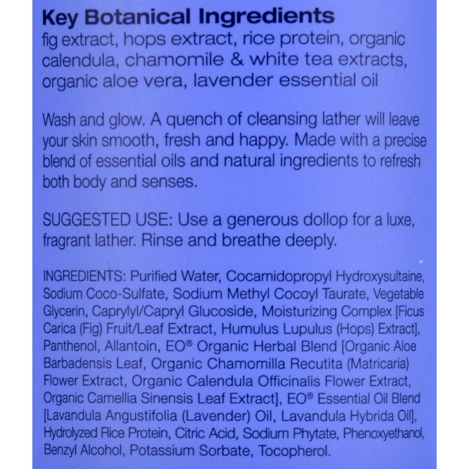 - Ingredients: PURIFIED WATER;COCAMIDOPROPYL HYDROXYSULTAINE;SODIUM COCO-SULFATE;SODIUM METHYL COCOYL TAURATE;GLYCERIN;CAPRYLYL/CAPRYL GLUCOSIDE;MOISTURIZING COMPLEX [FICUS CARICA;FIG;FRUIT/LEAF EXTRACT;HUMULUS LUPULUS;HOPS;EXTRACT];PANTHENOL;ALLANTOIN;EO® ORGANIC HERBAL BLEND [ORGANIC ALOE BARBADENSIS LEAF;ORGANIC CHAMOMILLA RECUTITA;MATRICARIA;FLOWER EXTRACT;ORGANIC CALENDULA OFFICINALIS FLOWER EXTRACT;ORGANIC CAMELLIA SINENSIS LEAF EXTRACT];EO® ESSENTIAL OIL BLEND [LAVANDULA ANGUSTIFOLIA;LAVENDER;OIL;LAVAND