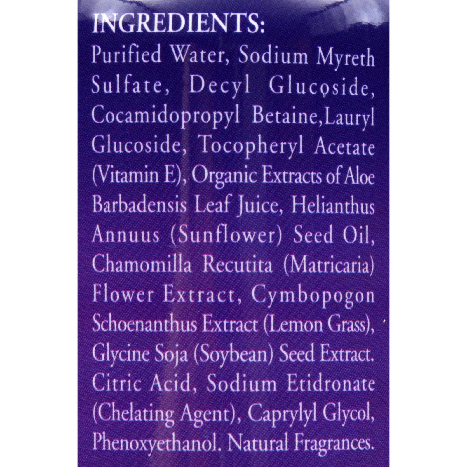 - Ingredients: PURIFIED WATER;SODIUM MYRETH SULFATE;DECYL GLUCOSIDE;COCAMIDOPROPYL BETAINE;LAURYL GLUCOSIDE;TOCOPHERYL ACETATE;VITAMIN E;ORGANIC EXTRACTS OF ALOE BARBADENSIS LEAF JUICE;HELIANTHUS ANNUUS;SUNFLOWER;SEED OIL;RECUTITA;MATRICARIA;FLOWER EXTRACT;CYMBOPOGON SCHOENANTHUS EXTRACT;LEMON GRASS;GLYCINE SOJA;SOYBEAN;SEED EXTRACT. CITRIC ACID;SODIUM ETIDRONATE;CHELATING AGENT;CAPRYLYL GLYCOL;PHENOXYETHANOL. NATURAL FRAGRANCES
