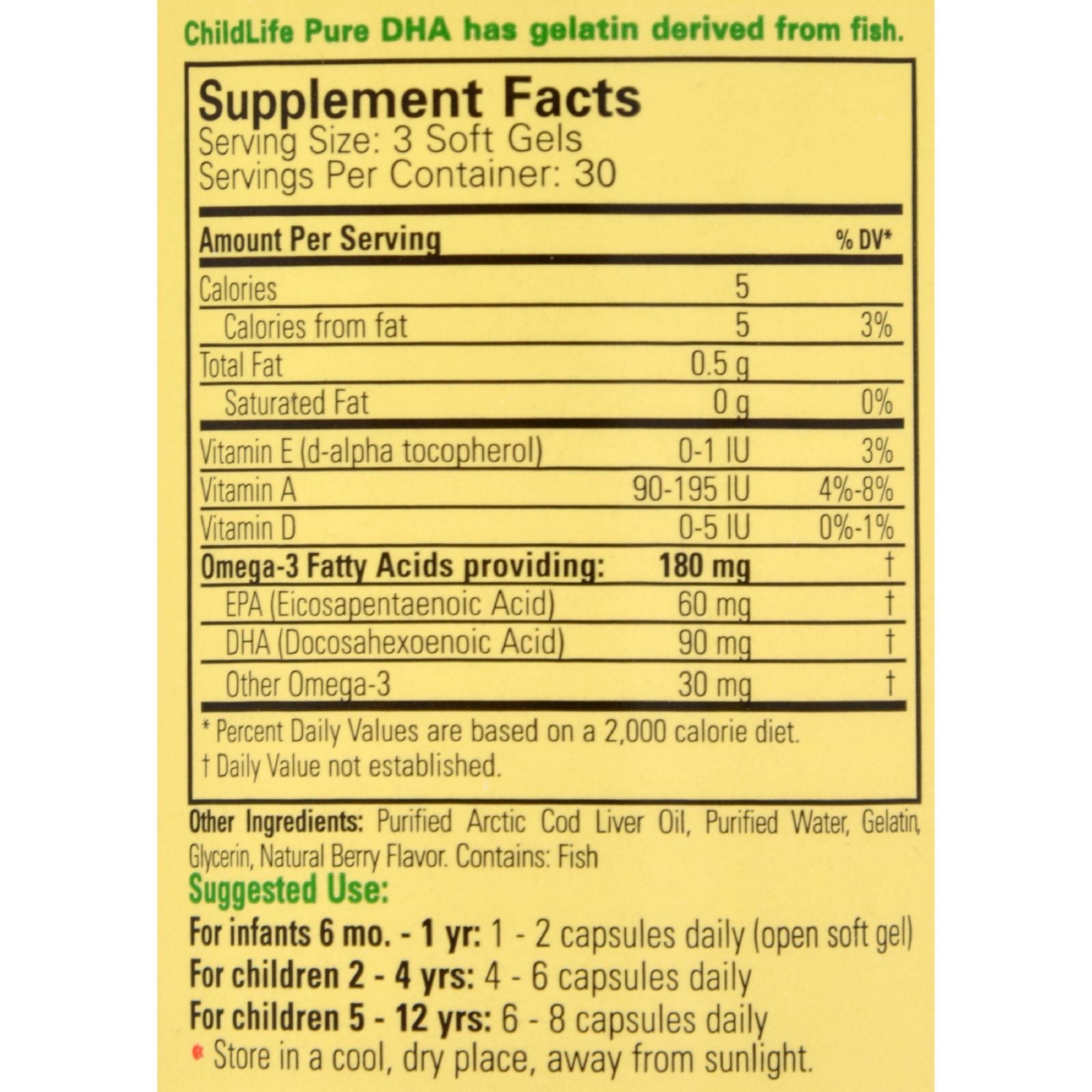 CHILD LIFE ESSENTIALS, PURE DHA 250 MG., BERRY IS RECOMMENDED FOR CHILDREN. THIS PRODUCT USES ONLY THE HIGHEST QUALITY INGREDIENTS, IS CASEIN FREE AND CONTAINS NO ALCOHOL AND HAS 90 SOFTGELS. CHILD LIFE ESSENTIALS, PURE DHA 250 MG., BERRY IS GLUTEN-FREE, DOES NOT CONTAIN YEAST OR CORN AND EACH SOFTGEL IS CHEWABLE. THIS PRODUCT DOES NOT HAVE ARTIFICIAL COLORINGS, FLAVORINGS OR SWEETENERS. PLEASE SEE NUTRITIONAL FACTS PANEL FOR POSSIBLE ALLERGENS AND WARNINGS PERTAINING TO CHILD LIFE ESSENTIALS, PURE DHA 250 MG., BERRY.