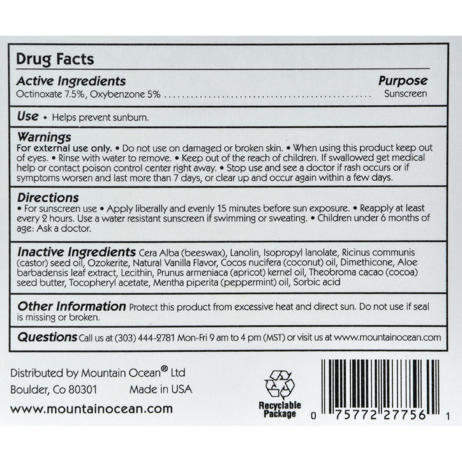 - Ingredients: ACTIVE OCTINOXATE 7.5%;OXYBENZONE 5% PURPOSE SUNSCREEN INACTIVE CERA ALBA;BEESWAX;LANOLIN;ISOPROPYL LANOLATE;RICINUS COMMUNIS;CASTOR;SEED OIL;OZOKERITE;NATURAL VANILLA FLAVOR;COCOS NUCIFERA;COCONUT;OIL;DIMETHICONE;ALOE BARBADENSIS LEAF EXTRACT;LECITHIN;PRUNUS ARMENIACA;APRICOT;KERNEL OIL;THEOBROMA CACAO;COCOA;SEED BUTTER;TOCOPHERYL ACETATE;MENTHA PIPERITA;PEPPERMINT;SORBIC ACID