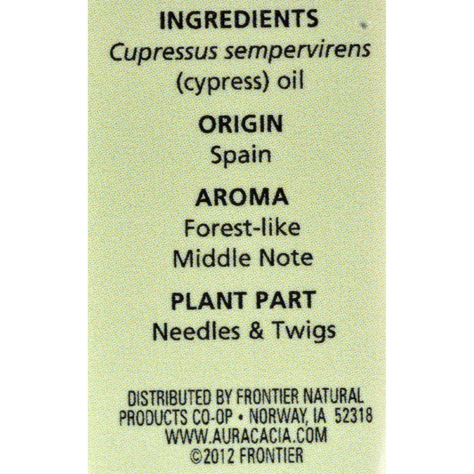 AURA CACIA ESSENTIAL OIL, CYPRESS IS A FOREST-LIKE OIL THAT HAS BENEFICIAL PROPERTIES. THIS OPENING OIL IS PERFECT IN A BODY REFRESHER AND INNER STRENGTH DIFFUSER. THIS 100% PURE ESSENTIAL OIL MUST BE DILUTED PROPERLY SINCE IT MAY IRRITATE THE SKIN. EACH BOTTLE OF AURA CACIA ESSENTIAL OIL, CYPRESS CONTAINS 0.5 FL. OZ. OF PRODUCT. SEE LABEL FOR WARNINGS.
