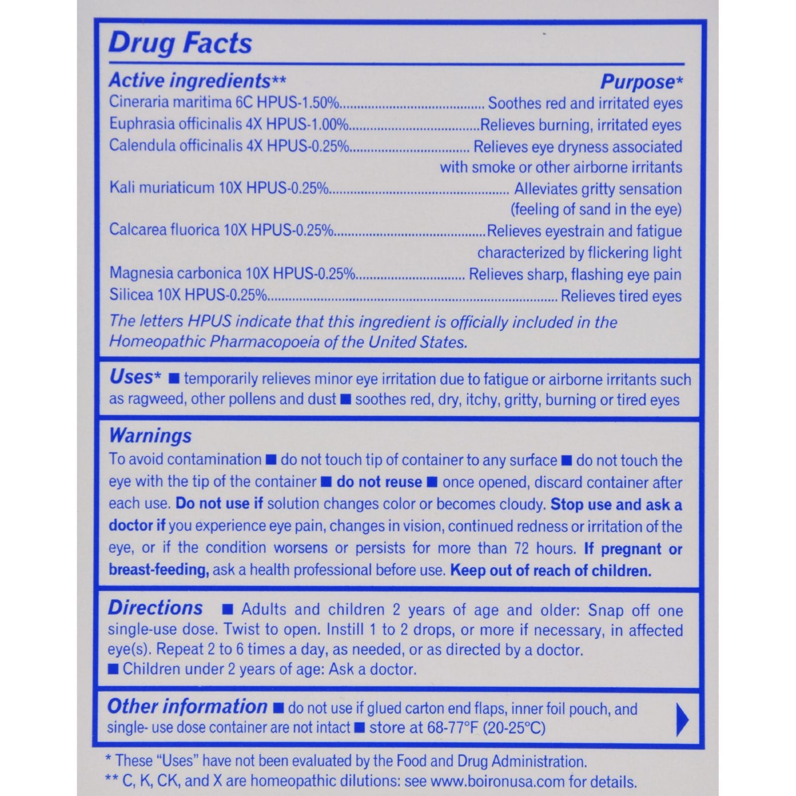 BOIRON EYE IRRITATION RELIEF IS A POWERFUL MEDICINAL LIQUID DESIGNED TO PROVIDE NATURAL RELIEF FOR IRRITATED EYES. MADE WITH A MINIMAL AMOUNT OF NATURAL INGREDIENTS, BOIRON EYE IRRITATION RELIEF IS LARGELY FREE FROM UNNATURAL AND UNNECESSARY ADDITIVES. THIS PRODUCT IS HOMEOPATHIC. EACH BOX OF BOIRON EYE IRRITATION RELIEF CONTAINS 10 DOSES OF PRODUCT. SEE LABEL FOR WARNINGS.