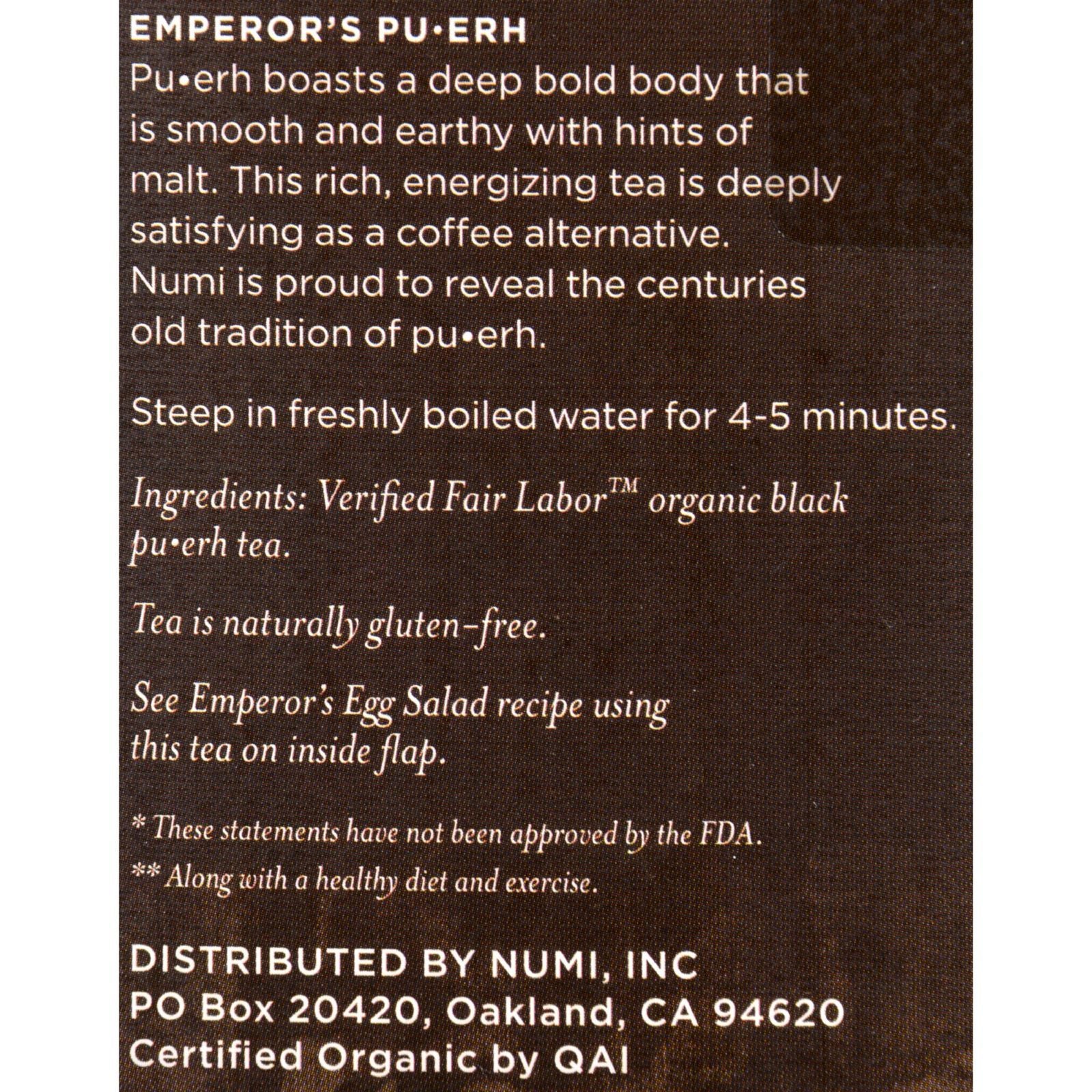 NUMI ORGANIC TEA PU-ERH TEA, EMPEROR'S PU-ERH IS ECO-RESPONSIBLE. THIS PRODUCT BOASTS A DEEP, BOLD BODY THAT IS SMOOTH AND EARTHY WITH HINTS OF MALT. NUMI ORGANIC TEA PU-ERH TEA, EMPEROR'S PU-ERH HAS A RICH, ENERGIZING TEA IS DEEPLY SATISFYING AS A COFFEE ALTERNATIVE. THIS PRODUCT COMES PACKAGED FOR CONVENIENCE AND CONTAINS 16 TEA BAGS OF PRODUCT.