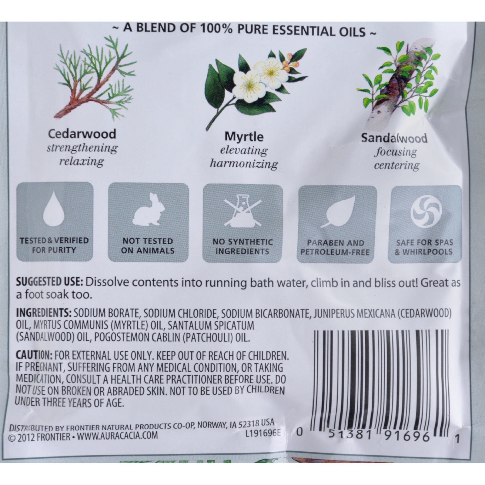 AURA CACIA MEDITATING CEDARWOOD AROMATHERAPY MINERAL BATH IS A BLEND OF MINERALS THAT LET YOU EMERGE FROM THE SOOTHING WATERS OF YOUR TUB FEELING REFRESHED AND VELVETY SMOOTH. MADE FROM 100% PURE ESSENTIAL OILS, THIS MINERAL BATH LETS YOU CREATE AN AT-HOME SPA TREATMENT THAT STABILIZES THE SENSES, TONES THE BODY AND ANCHORS THE SPIRIT. THIS MINERAL BATH CONTAINS THREE MAIN SCENTS: CEDARWOOD FOR STRENGTHENING AND RELAXING, MYRTLE FOR ELEVATING AND HARMONIZING AND SANDALWOOD FOR FOCUSING AND CENTERING. THIS MINERAL BATH IS NOT TESTED ON ANIMALS, IS SAFE FOR SPAS AND WHIRLPOOLS AND DOES NOT CONTAIN SYNTHETIC INGREDIENTS, PETROLEUM OR PARABENS. EACH PACKET OF AURA CACIA MEDITATING CEDARWOOD AROMATHERAPY MINERAL BATH CONTAINS 2.5 OZ. OF PRODUCT. SEE LABEL FOR WARNINGS.