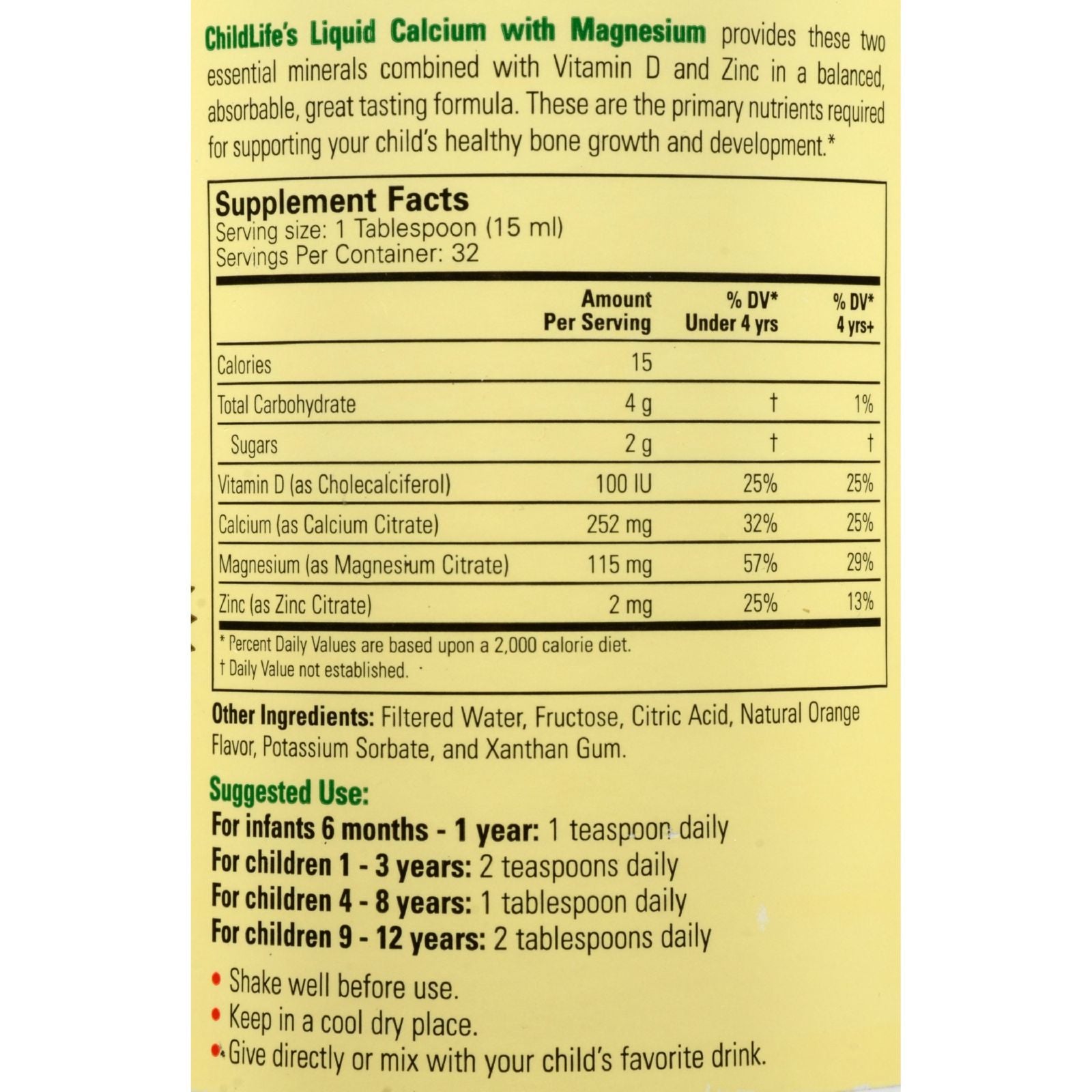 CHILD LIFE ESSENTIALS, LIQUID CALCIUM, ORANGE WITH MAGNESIUM IS RECOMMENDED FOR CHILDREN. THIS PRODUCT USES ONLY THE HIGHEST QUALITY INGREDIENTS, IS CASEIN FREE AND CONTAINS NO ALCOHOL. CHILD LIFE ESSENTIALS, LIQUID CALCIUM, ORANGE WITH MAGNESIUM IS GLUTEN-FREE AND DOES NOT CONTAIN MILK, EGGS, WHEAT, YEAST, OR CORN. THIS PRODUCT DOES NOT HAVE ARTIFICIAL COLORINGS, FLAVORINGS OR SWEETENERS AND COMES IN A 16 FL. OZ. BOTTLE. PLEASE SEE NUTRITIONAL FACTS PANEL FOR POSSIBLE ALLERGENS AND WARNINGS PERTAINING TO CHILD LIFE ESSENTIALS, LIQUID CALCIUM, ORANGE WITH MAGNESIUM.
