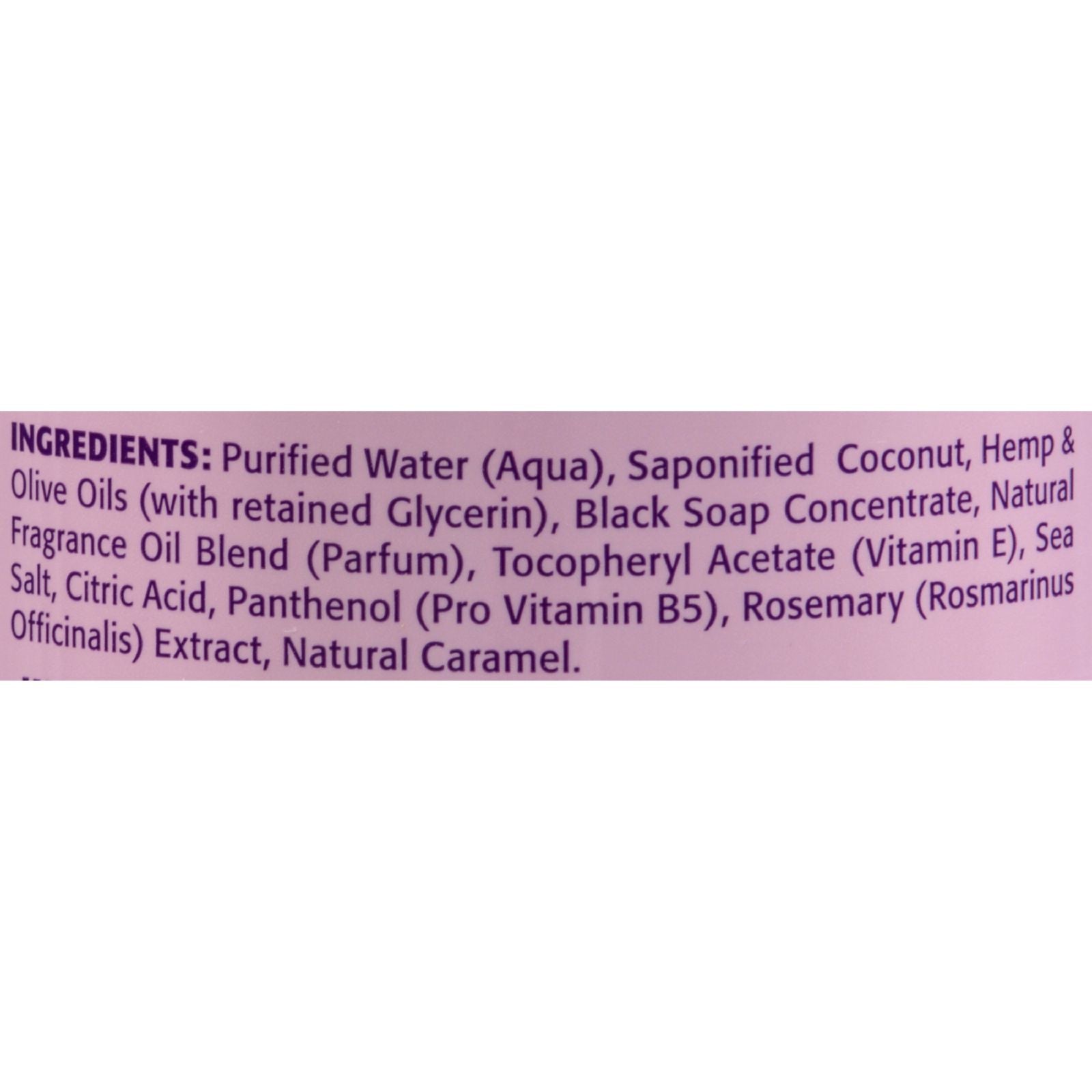 - Ingredients: Purified Water (Aqua), Saponified Coconut, Hemp and Olive Oils (with retained Glycerin), Pure Black Soap, Fragrance, Tocopherol (Vitamin E), Sea Salt, Citric Acid, Panthenol (Pro Vitamin B5), Rosemary (Rosemarinus Officinalis) Extract, Natural Caramel.