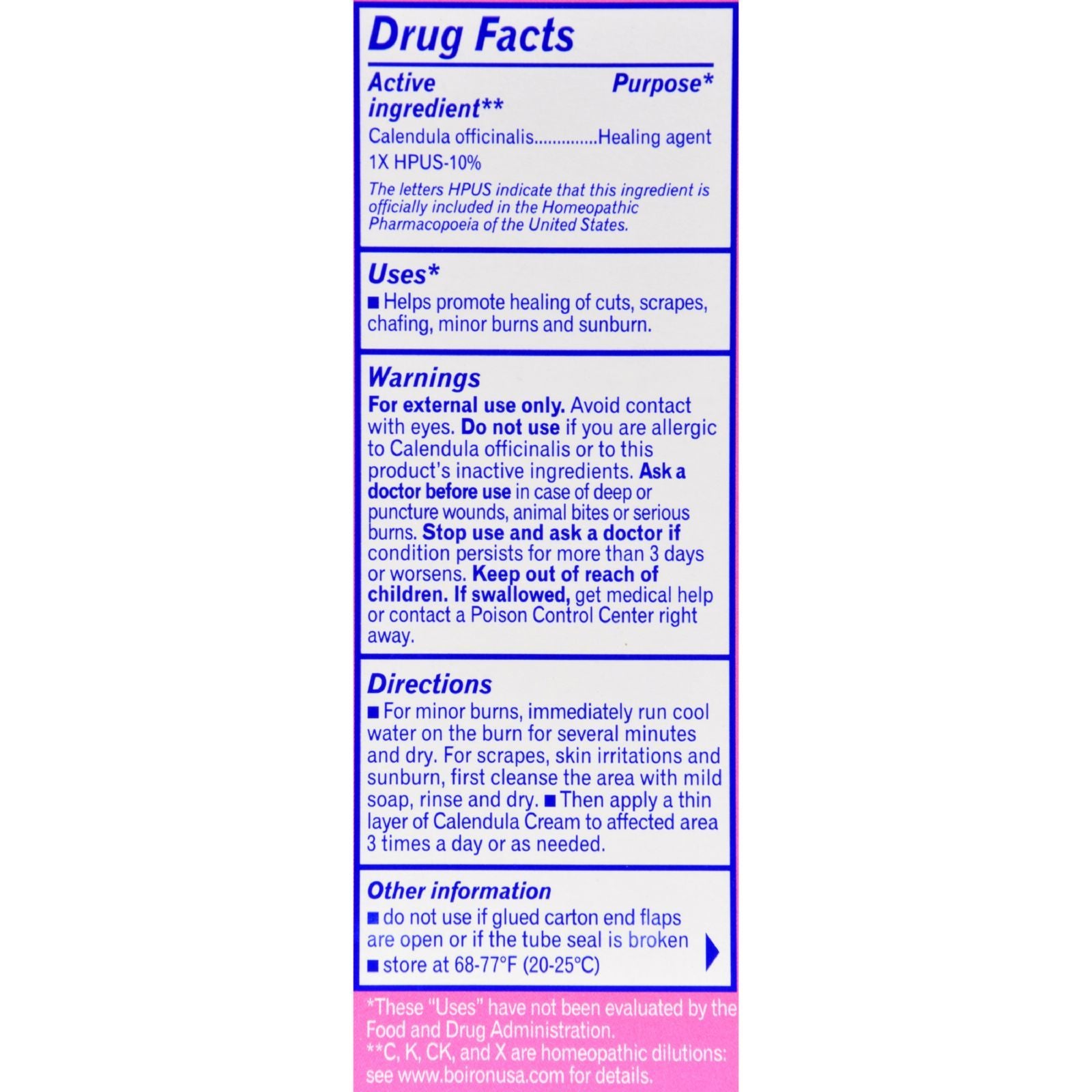 BOIRON TOPICAL CALENDULA CREAM, FIRST AID IS A POWERFUL CREAM FOR USE IN MINOR FIRST AID CARE. MADE PRIMARILY FROM NATURALLY DERIVED INGREDIENTS, BOIRON TOPICAL CALENDULA CREAM, FIRST AID IS LARGELY FREE OF UNNATURAL AND UNNECESSARY ADDITIVES. THIS PRODUCT IS HOMEOPATHIC AND DOES NOT CONTAIN PARABENS. EACH BOX OF BOIRON TOPICAL CALENDULA CREAM, FIRST AID WEIGHS 2.5 OZ. SEE LABEL FOR WARNINGS.