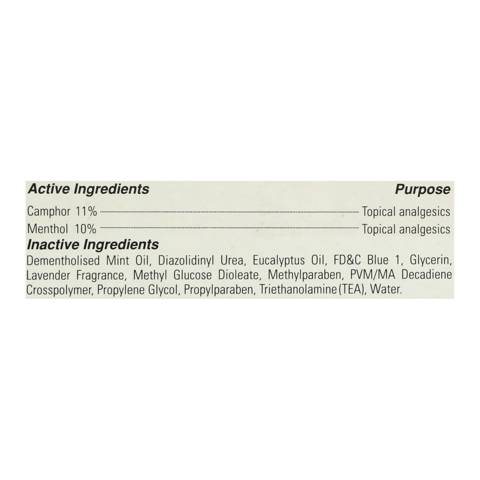 - Ingredients: Active Ingredients: Camphor (11 %), Topical Analgesics; Menthol (10 %), Topical Analgesics. Inactive Ingredients: Dementholised Mint Oil, Diazolidinyl Urea, Eucalyptus Oil, FD&C Blue 1, Glycerin, Lavender Fragrance, Methyl Glucose Dioleate, Methylparaben, PVM/MA Decadiene Crosspolymer, Propylene Glycol, Propylparaben, Triethanolamine (TEA), Water.