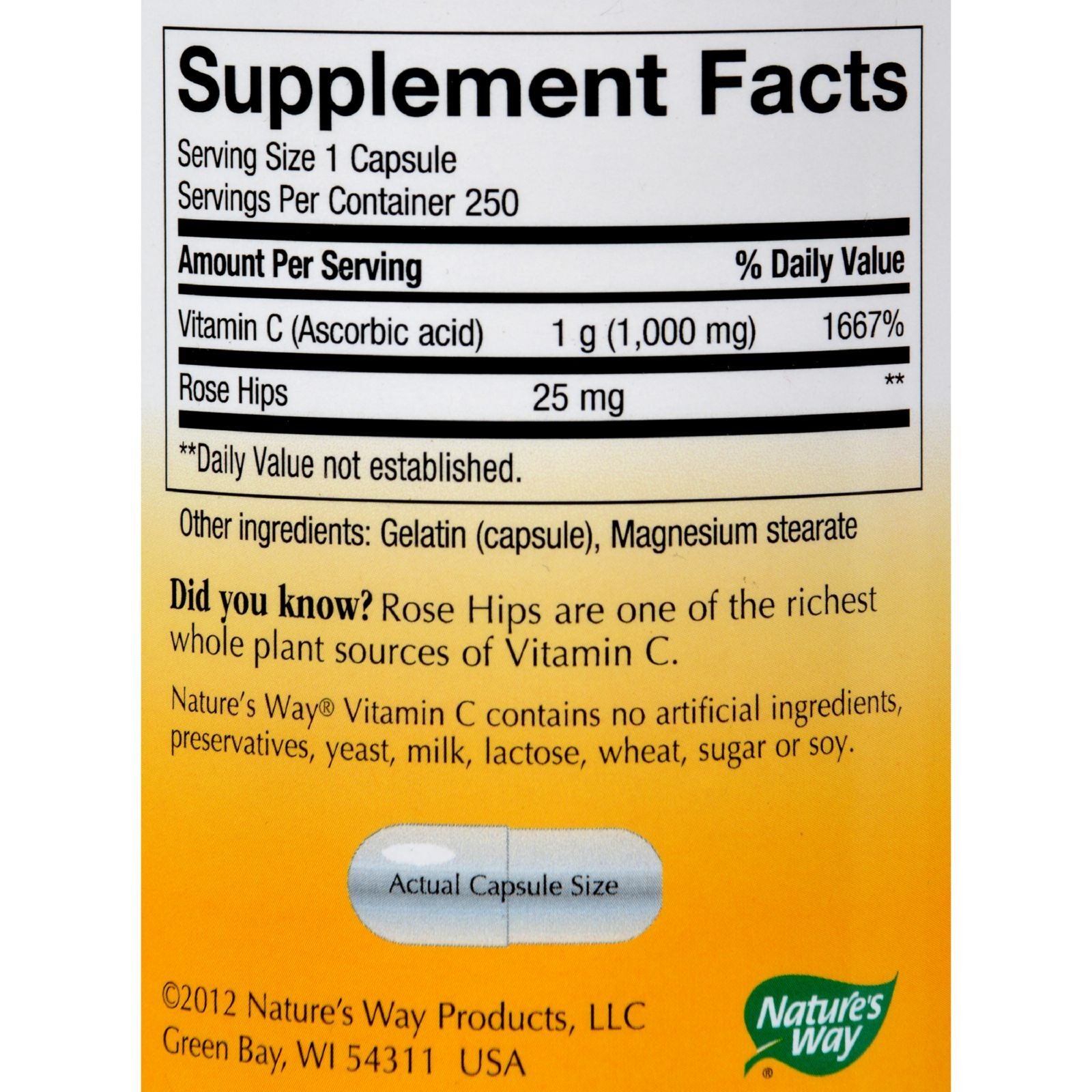 Dietary Supplement. Premium quality. Certified potency. Anti-oxidant. Health & longevity through he healing power of nature-that's what it means to trust the leaf. Vitamin C with Rose Hips provides powerful antioxidant protection, strengthens collagen and helps maintain white blood cell function. Our vitamin C is tested and produced to certified quality standards. Did you know? Rose hips are one of the richest whole plant source of vitamin C. Nature's Way Vitamin C contains no artificial ingredients, preservatives, yeast, milk, lactose, wheat, sugar or soy. (This statement has not been evaluated by the Food and Drug Administration. This product is not intended to diagnose, treat, cure or prevent any disease.) Visit naturesway.com. Satisfaction guaranteed.