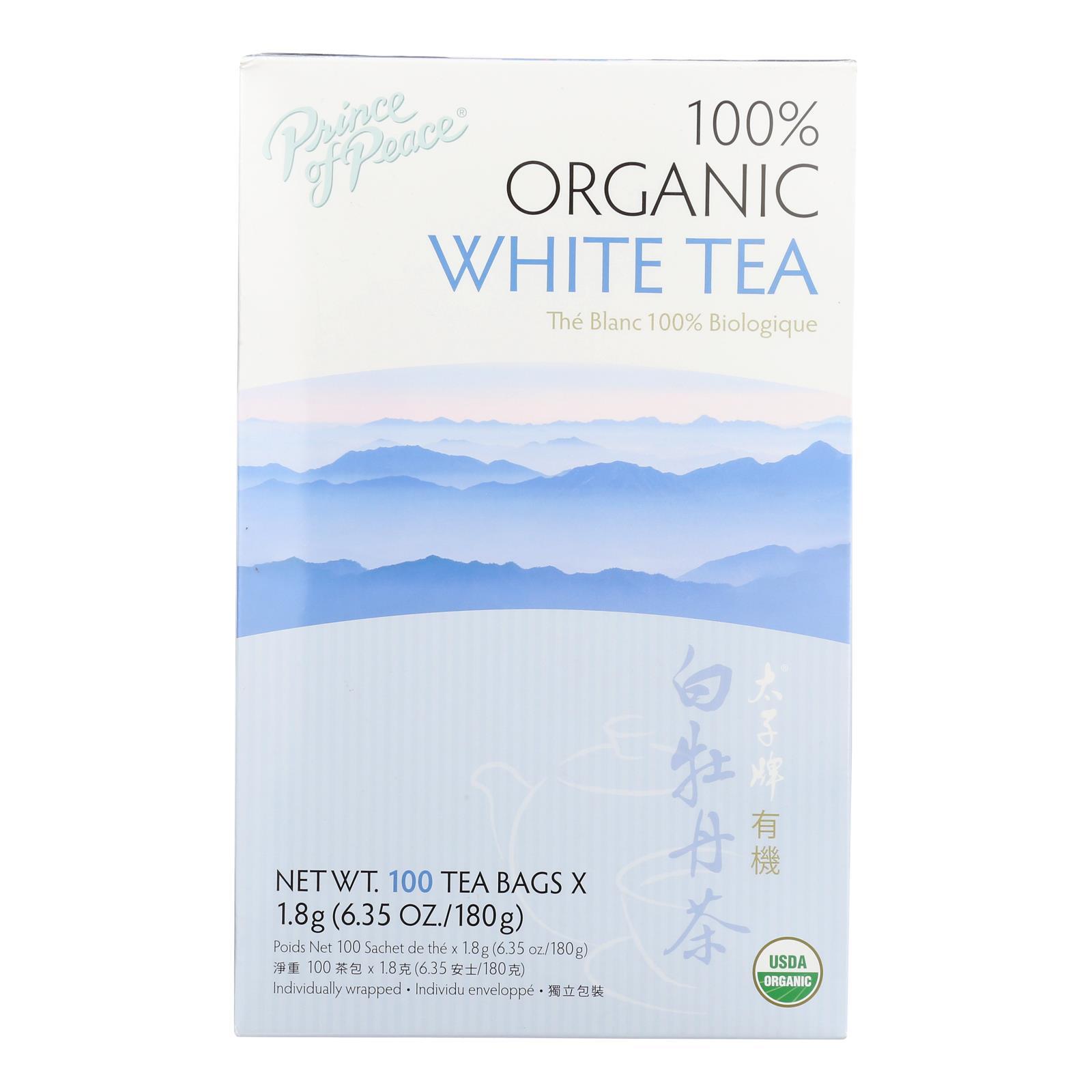 PRINCE OF PEACE 100% ORGANIC WHITE TEA IS MADE FROM LEAVES AND BUDS THAT ARE HARVESTED AT A YOUNG AGE. MADE WITH A ZHENGE PROCESSING STYLE, THIS TEA IS FORMULATED FOR A FULL BODY AND A RICH SCENT. EACH CUP PROVIDES A BURST OF ANTIOXIDANTS AND 0 CALORIES, SO YOU CAN ENJOY IT AS A GUILT-FREE DRINK. EACH BAG IN THIS 100-COUNT BOX IS INDIVIDUALLY WRAPPED FOR EASY USE. SIMPLY DROP A BAG INTO A MUG OF HOT WATER FOR A FRESH CUP.