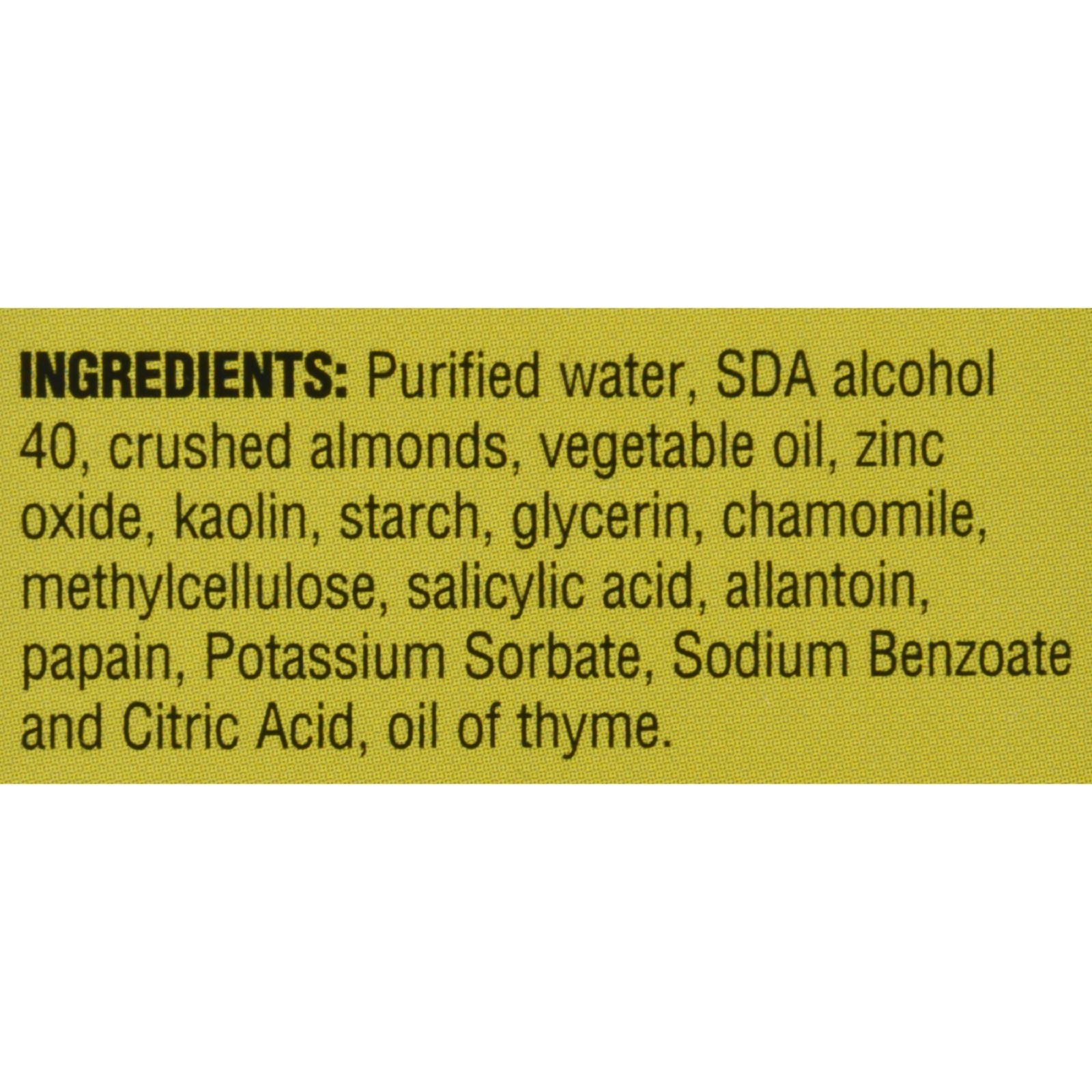- Ingredients: PURIFIED WATER;SDA ALCOHOL 40;CRUSHED ALMONDS;VEGETABLE OIL;ZINC OXIDE;KAOLIN;STARCH;GLYCERIN;CHAMOMILE;METHYLCELLULOSE;SALICYLIC ACID;ALLANTOIN;PAPAIN;SODIUM BENZOATE;POTASSIUM SORBATE;CITRIC ACID;OIL OF THYME