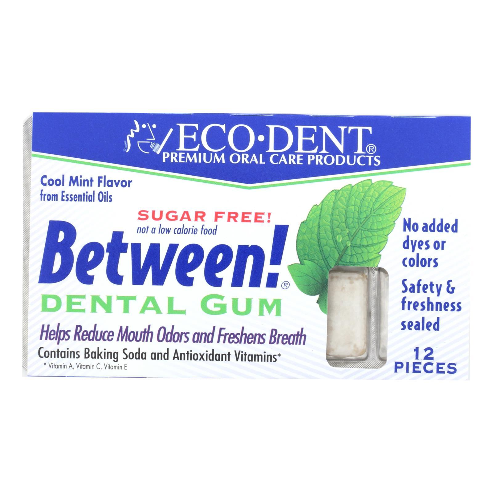 ECODENT DENTAL GUM, BETWEEN! COOL MINT IS A SUGAR FREE GUM THAT CONTAINS 25% OF THE DAILY VALUE FOR ANTIOXIDANT VITAMINS A, C AND E PLUS THE CLEANING AND ALKALIZING POWER OF BAKING SODA AND XYLITOL. YOU CAN ENJOY WHILE IT GIVES YOU FRESHER BREATH AND HELPS PREVENT TOOTH DECAY. THIS GUM IS NOT TESTED ON ANIMALS. EACH BOX CONTAINS 12 PIECES OF GUM. SEE NUTRITION FACTS PANEL FOR ALLERGENS.