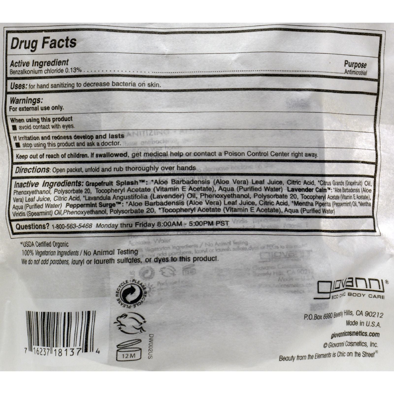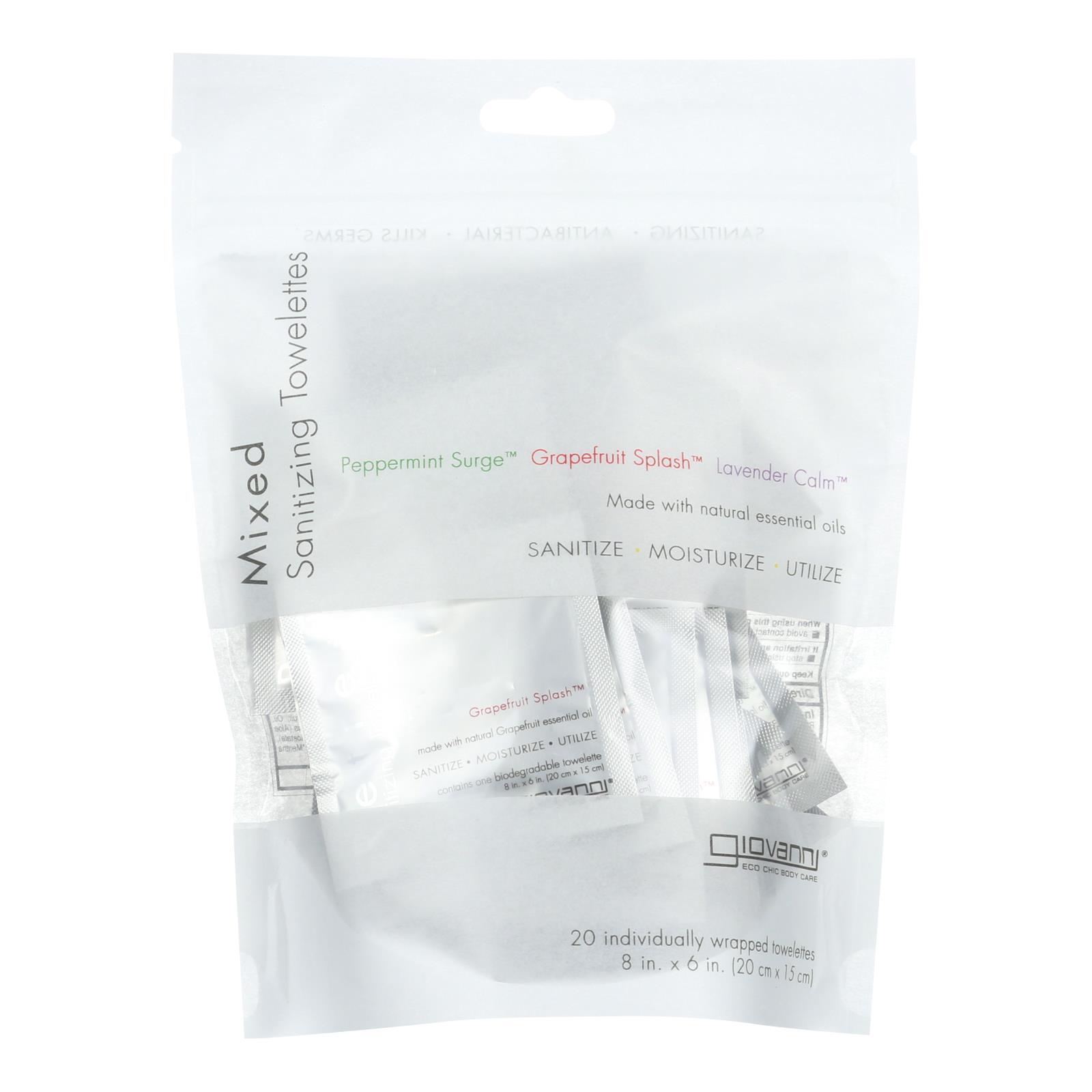 GIOVANNI ECO CHIC BODY CARE MIXED SCENTS SANITIZING TOWELETTES CLEAN YOUR HANDS WHILE KEEPING THEM SOFT AND LIGHTLY FRAGRANCED WITH ORGANIC ESSENTIAL OILS. THE 20-COUNT PACK FEATURES THREE POPULAR SCENTS, INCLUDING GRAPEFRUIT, LAVENDER AND PEPPERMINT. THROW A COUPLE OF PACKS IN YOUR PURSE FOR USE AT WORK OR PUBLIC PLACES AND ADD A FEW TO YOUR KIDS' BACKPACKS SO THEY ALWAYS HAVE THEM AT SCHOOL FOR CLEAN HANDS.