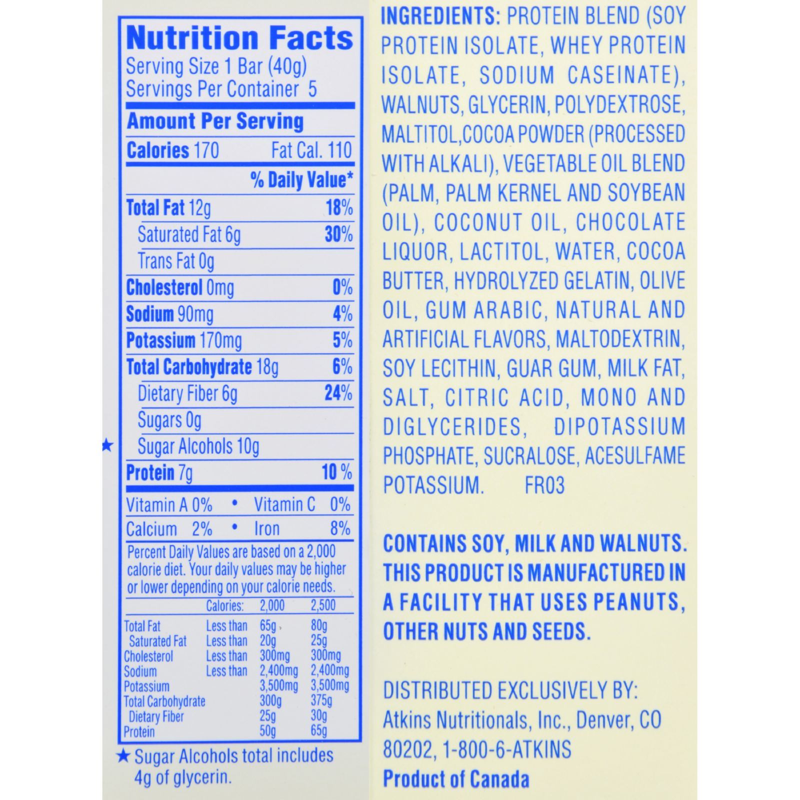 - Ingredients: WALNUTS;GLYCERIN;POLYDEXTROSE;MALTITOL;SOY PROTEIN ISOLATE;COCOA POWDER (PROCESSED WITH ALKALI);PALM KERNEL AND PALM OIL;COCONUT OIL;WHEY PROTEIN ISOLATE;LACTITOL;UNSWEETENED CHOCOLATE;COLLAGEN;COCOA BUTTER;OLIVE OIL;CONTAINS LESS THAN 2% OF GUM ARABIC;SODIUM CASEINATE;NATURAL AND ARTIFICIAL FLAVORS;SOY LECITHIN;GUAR GUM;MILKFAT;SALT;SUCRALOSE;CITRIC ACID;ACESULFAME POTASSIUM