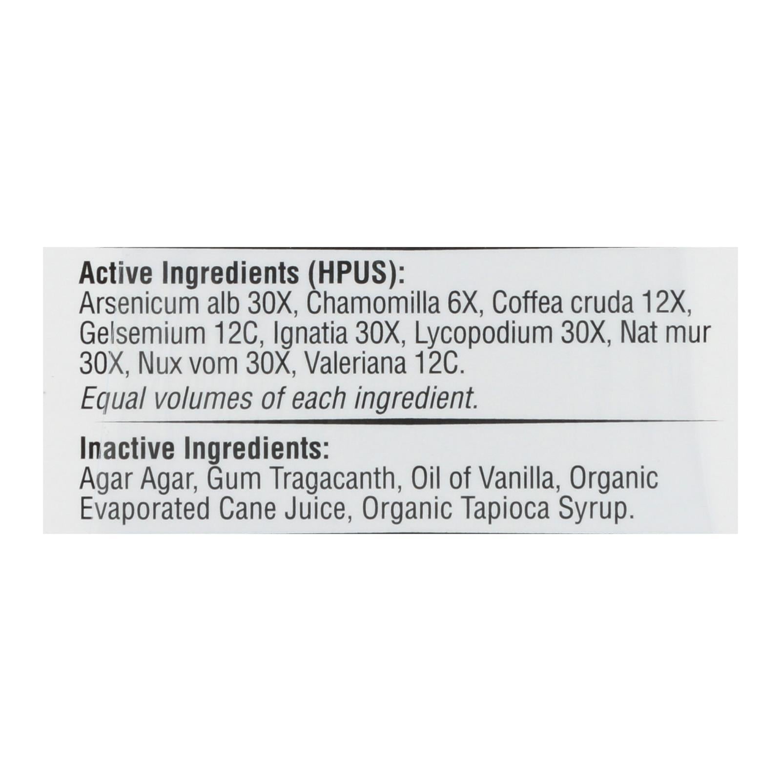 - Ingredients: DEXTROSE MONOHYDRATE;MAGNESIUM STEARATE;MALTODEXTRIN;ORGANIC VANILLA FLAVOR;ARSENICUM ALB 30X;CHAMOMILLA 6X;COFFEA CRUDA 12X;GELSEMIUM 12C;IGNATIA 30X;LYCOPODIUM 30X;NAT MUR 30X;NUX VOM 30X;VALERIANA 12C