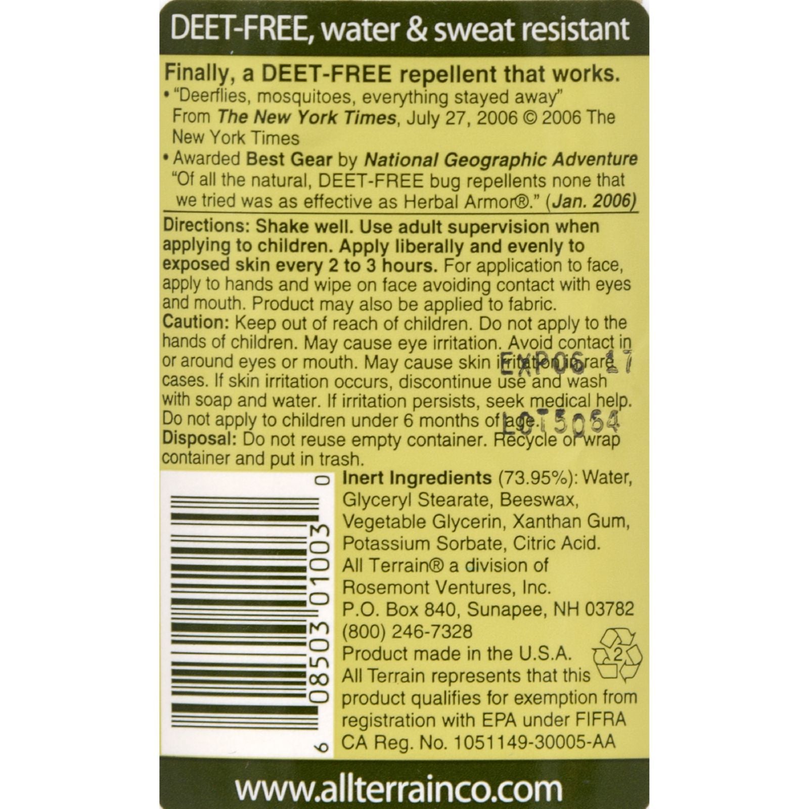 All Terrain Herbal Armor Natural Insect Repellent Description: Proven Effective Awarded Best Gear Cruelty Free DEET-FREE Pump Spray Active Ingredients: >> Oil of Soybean............11.5% >> Oil of Citronella..........10.0% >> Oil of Peppermint........2.0% >> Oil of Cedar.................1.50% >> Oil of Lemongrass.......1.00% >> Oil of Geranium...........0.05% *Inert Ingredients...........73.95% DEET-FREE, water and sweat resistantFinally, a DEET-FREE repellent that works.>> Awarded Best Gear by National Geographic Adventure "Of all the natural, DEET-FREE bug repellents none that we tried was as effective as Herbal Armor." >> "Deerflies, mosquitoes, everything stayed away" New York Times 07/26/06 Disclaimer These statements have not been evaluated by the FDA. These products are not intended to diagnose, treat, cure, or prevent any disease.