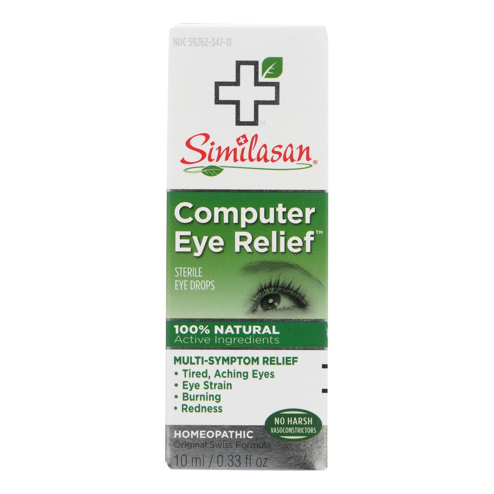 SIMILASAN COMPUTER EYE RELIEF STERILE EYE DROPS ARE A HOMEOPATHIC EYE DROP PRODUCT MEANT TO PROVIDE MULTI-SYMPTOM RELIEF FOR TIRED, ACHING EYES, EYE STRAIN AND BURNING REDNESS. THIS 10 ML. BOX OF STERILE EYE DROPS MADE WITH 100% NATURAL ACTIVE INGREDIENTS HELPS YOUR EYES FEEL REFRESHED BY STIMULATING THE BODY'S NATURAL ABILITY TO TEMPORARILY RELIEVE THE SYMPTOMS OF EYE FATIGUE.