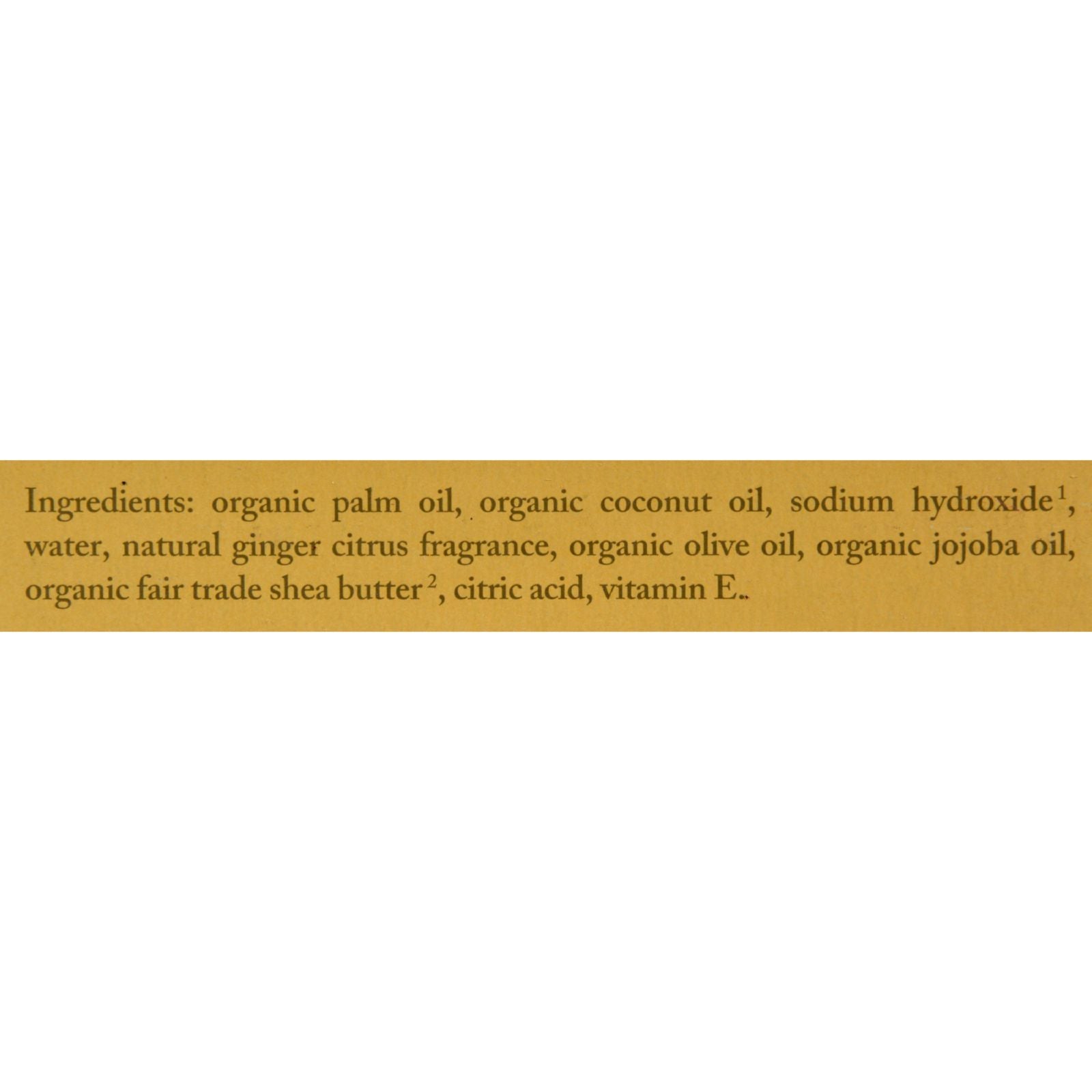- Ingredients: SAPONIFIED MASS BALANCE SUSTAINABLE PALM OIL;SAPONIFIED COCONUT OIL;WATER;RETAINED VEGETABLE GLYCERIN;NATURAL GINGER CITRUS FRAGRANCE;OLIVE OIL;JOJOBA OIL;ORGANIC FAIR TRADE SHEA BUTTER¹;VITAMIN. E;SODIUM GLUCONATE;ROSEMARY EXTRACT;SODIUM CHLORIDE