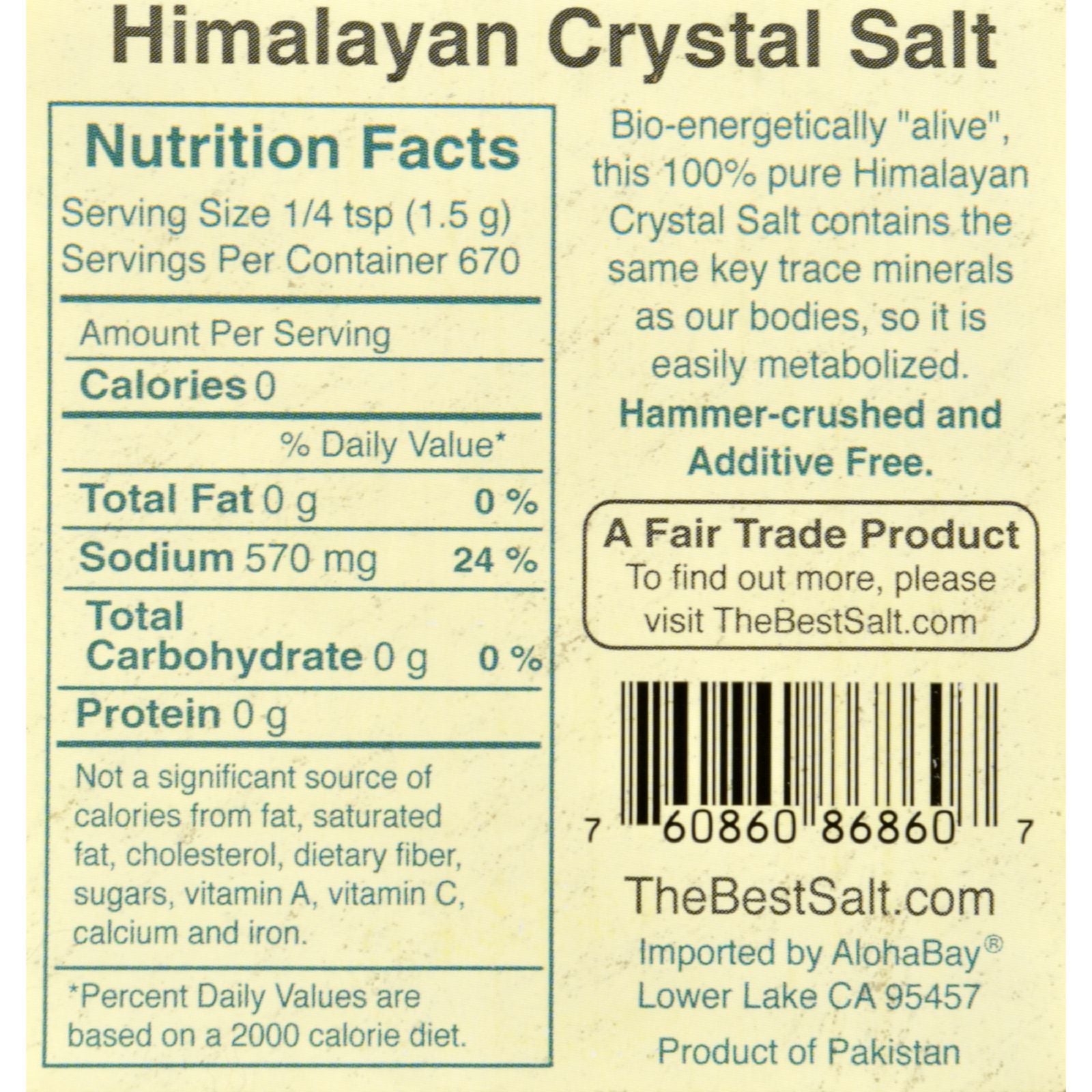 Himalayan Salt Table and Cooking Salt By Aloha Bay is fine crystals of the "best salt on earth!" Gourmet cooks recommend the exquisite taste of wholesome, natural, pink Himalayan crystal salt. Bio-energetically "alive", this salt contains the same 84 key trace minerals as found in your body, so it is easily metabolized. Hammer-crushed and additive-free, this salt is pinkish in color due to the minerals it contains. This item is a fair trade product from the Salt Range region of Pakistan.