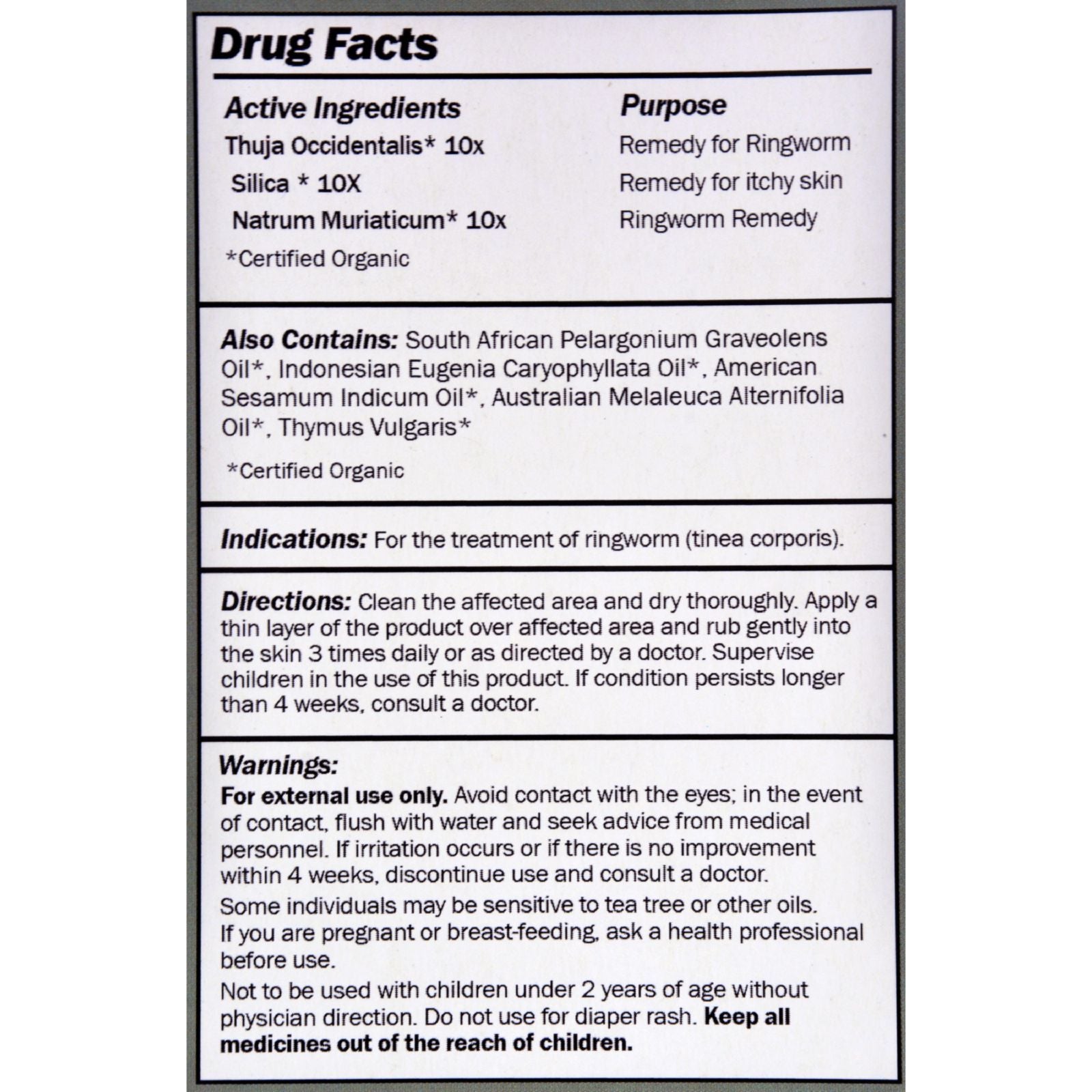 - Ingredients: SESAME OIL;TEA TREE OIL;ROSE GERANIUM OIL;THYME OIL;CLOVE OIL;THUJA OCCIDENTALIS* 10X;COMMON NAME: NORTHERN WHITE CEDAR;- REMEDY FOR RINGWORM SILICEA* 10X;COMMON NAME: QUARTZ;- REMEDY FOR ITCHY SKIN NATRUM MURIATICUM 10X;COMMON NAME: SODIUM CHLORIDE;- RINGWORM REMEDY