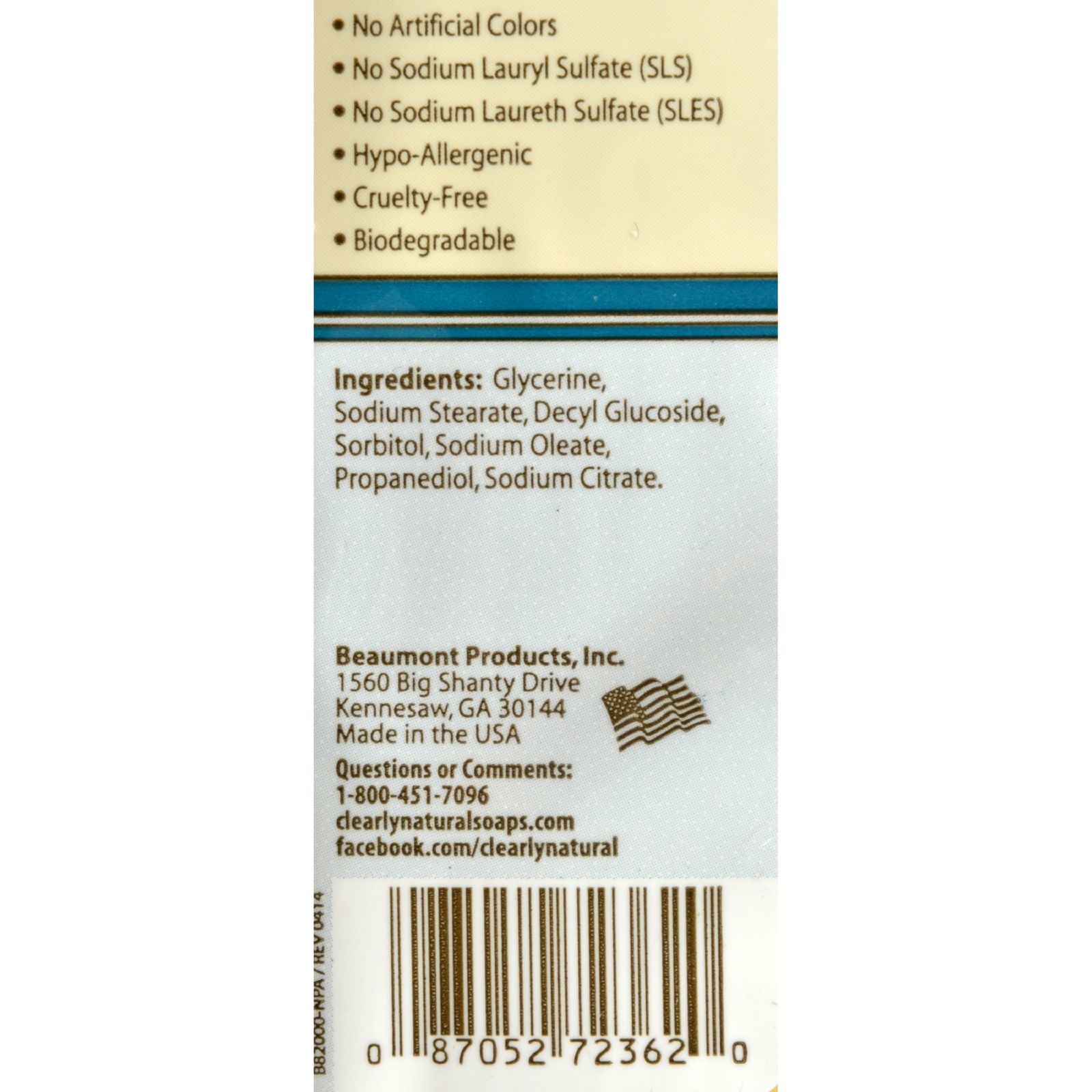 All natural glycerine soap made with the finest ingredients. Clean the World. www.cleantheworld.org. Soap saves lives! By purchasing this product, you help clean the world donate soap to stop the spread of preventable diseases around the globe. No artificial colors. No sodium lauryl sulfate (SLS). No sodium laureth sulfate (SLES). Hypo-allergenic. Cruelty-free. Biodegradable. Questions or comments: www.clearlynaturalsoaps.com. www.facebook.com/clearlynatural. Made in U.S.A.