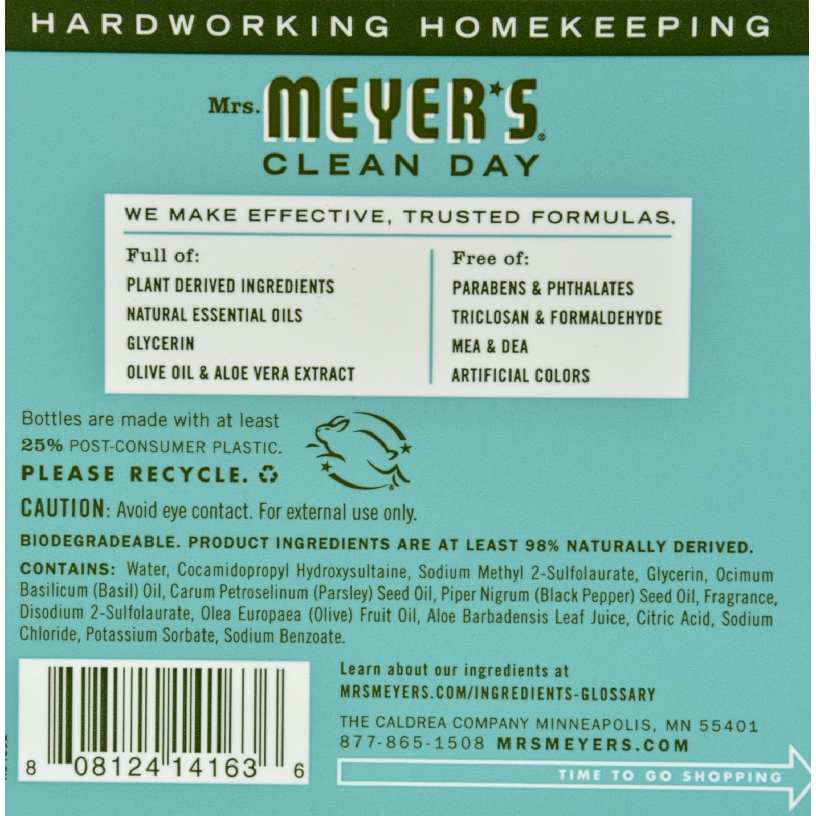 MRS. MEYER'S CLEAN DAY BASIL HAND SOAP REFILL IS MADE WITH PLANT-DERIVED INGREDIENTS, NATURAL ESSENTIAL OILS, ALOE VERA EXTRACT AND OLIVE OIL. OUR BIODEGRADABLE SOAP CLEANS HANDS WITHOUT PARABENS, PHTHALATES, OR ARTIFICIAL COLORS. EACH HAND SOAP REFILL COMES IN ONE 33 OZ. BOTTLE AND IS CERTIFIED CRUELTY-FREE.