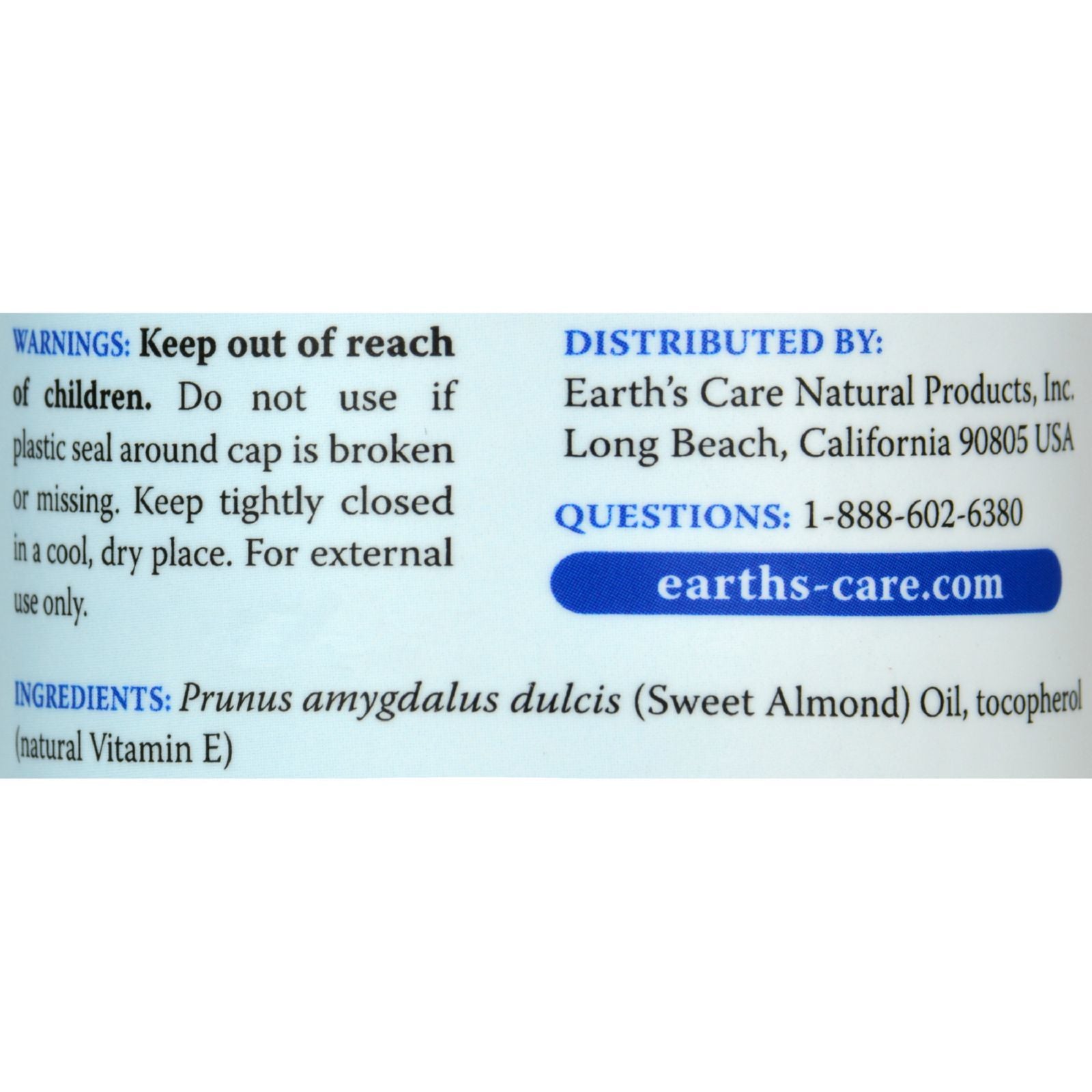 This is a bottle of 100% pure and natural Earth's Care Sweet Almond Oil. This product is bottled in the USA in an FDA regulated and inspected facility. The bottle is made out of amber glass and has a plastic tamper evident seal around the cap. Each bottle is has a lot number unique to its production lot. Earth's Care is a member of 1% for the Planet and donates 1% of its worldwide revenue to organizations that work to preserve and protect the environment. HISTORY: Evidence indicates that early inhabitants of the Mediterranean and Near East were using almonds as far back as 3000 B.C.. Today, almonds are revered as a versatile crop for culinary and cosmetic purposes. Expeller-pressed from the dried kernel, sweet almond oil is naturally rich in Vitamin E and has myriad applications for body and face.