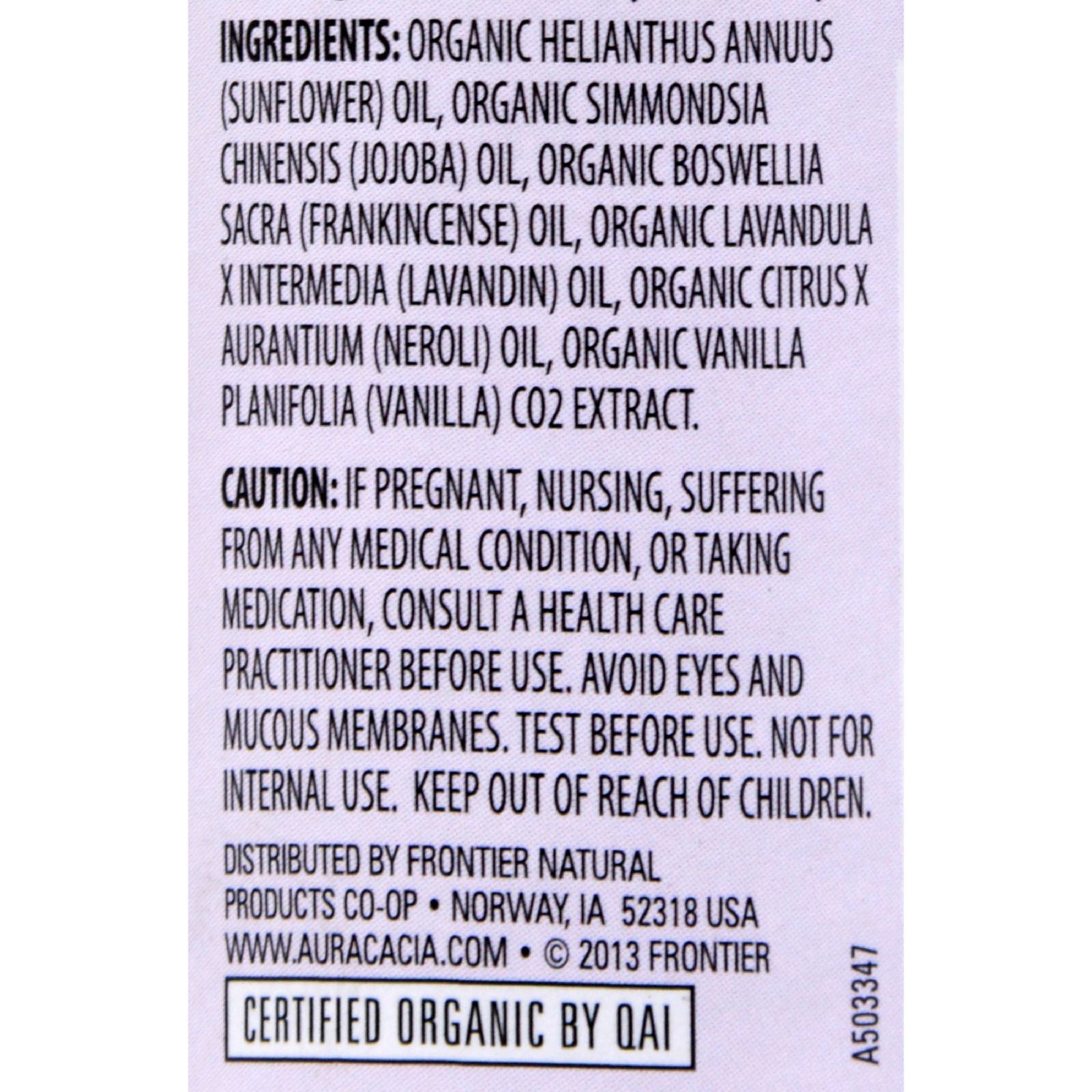 - Ingredients: ORGANIC HELIANTHUS ANNUUS;SUNFLOWER;OIL;ORGANIC SIMMONDSIA CHINENSIS;JOJOBA;ORGANIC BOSWELLIA SACRA;FRANKINCENSE;ORGANIC LAVANDULA X INTERMEDIA;LAVANDIN;ORGANIC CITRUS X AURANTIUM;NEROLI;ORGANIC VANILLA PLANIFOLIA;VANILLA;CO2 EXTRACT