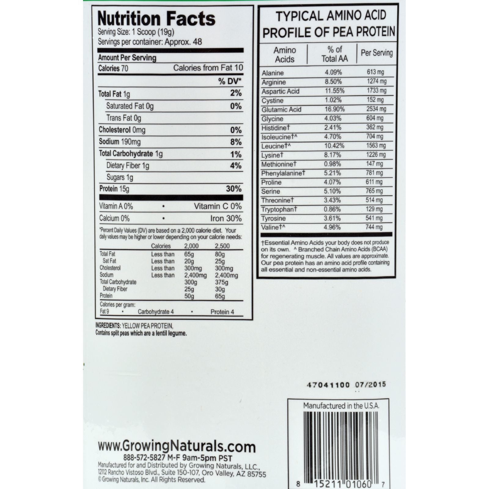 GROWING NATURALS ORIGINAL YELLOW PEA PROTEIN GOLD STANDARD RAW PEA POWDER USES RAW PEAS GROWN IN THE USA AND CANADA TO DELIVER A PROTEIN POWDER PACKED WITH KEY AMINO ACIDS THAT PROVIDE MUSCLE FUEL AND AID IN RECOVERY AFTER ACTIVITIES. JUST MIX ONE SCOOP WITH 8-12 OZ. OF WATER, MILK, OR YOUR FAVORITE BEVERAGE, STIR AND DRINK. THIS CONTAINER HOLDS 32.2 OZ. OF RAW PEA POWDER.