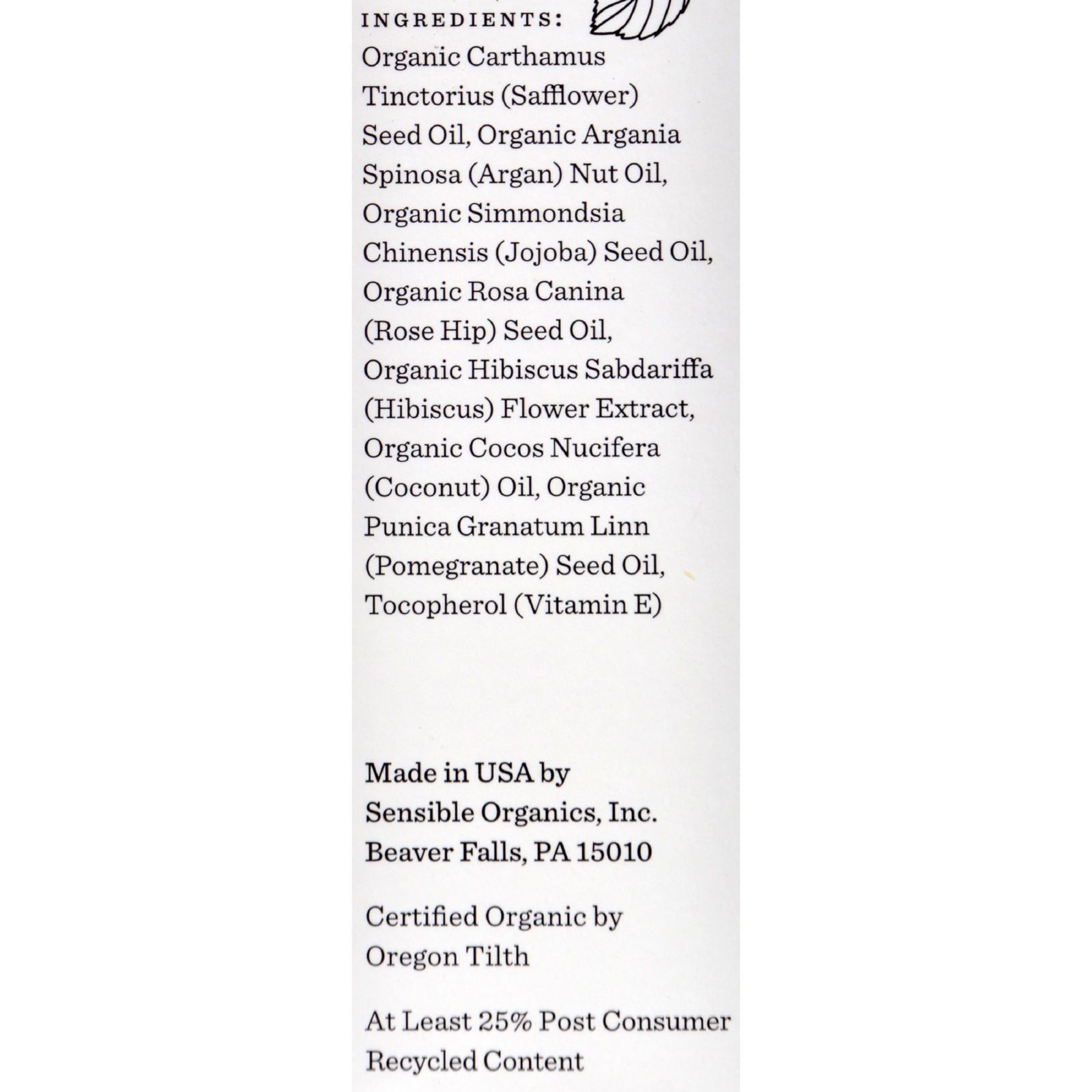 - Ingredients: CARTHAMUS TINCTORIUS (SAFFLOWER) SEED OIL;ARGANIA SPINOSA (ARGAN) NUT OIL;SIMMONDSIA CHINENSIS (JOJOBA) SEED OIL;ROSA CANINA (ROSE HIP) SEED OIL;HIBISCUS SABDARIFFA (HIBISCUS) FLOWER EXTRACT;COCONUT NUCIFERA (COCONUT) OIL;PUNICA GRANATUM LINN (POMEGRANATE) SEED OIL;TOCOPHEROL (VITAMIN E)