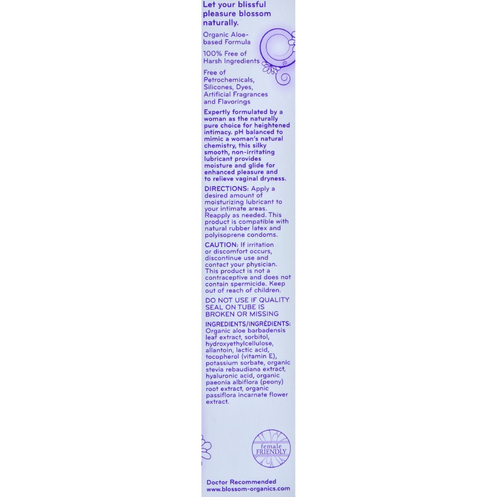 Let sensuality blossom into pleasure. Our female lubricant has been expertly formulated as the naturally pure choice for women seeking a heightened sense of intimacy. pH balanced to mimic a woman's natural chemistry and free of harsh ingredients, this silky smooth water-based lubricant is safe, non-irritating and provides moisture for enhanced pleasure and to relieve vaginal dryness. 100% free of harsh ingredients Formulated without parabens, petroleum, silicones, alcohol, hormones, artificial fragrances, dyes or flavorings pH balanced for a woman Glycerin-free, aloe-based formula Naturally pure organic ingredients Compatible with natural rubber latex and polyisoprene condoms
