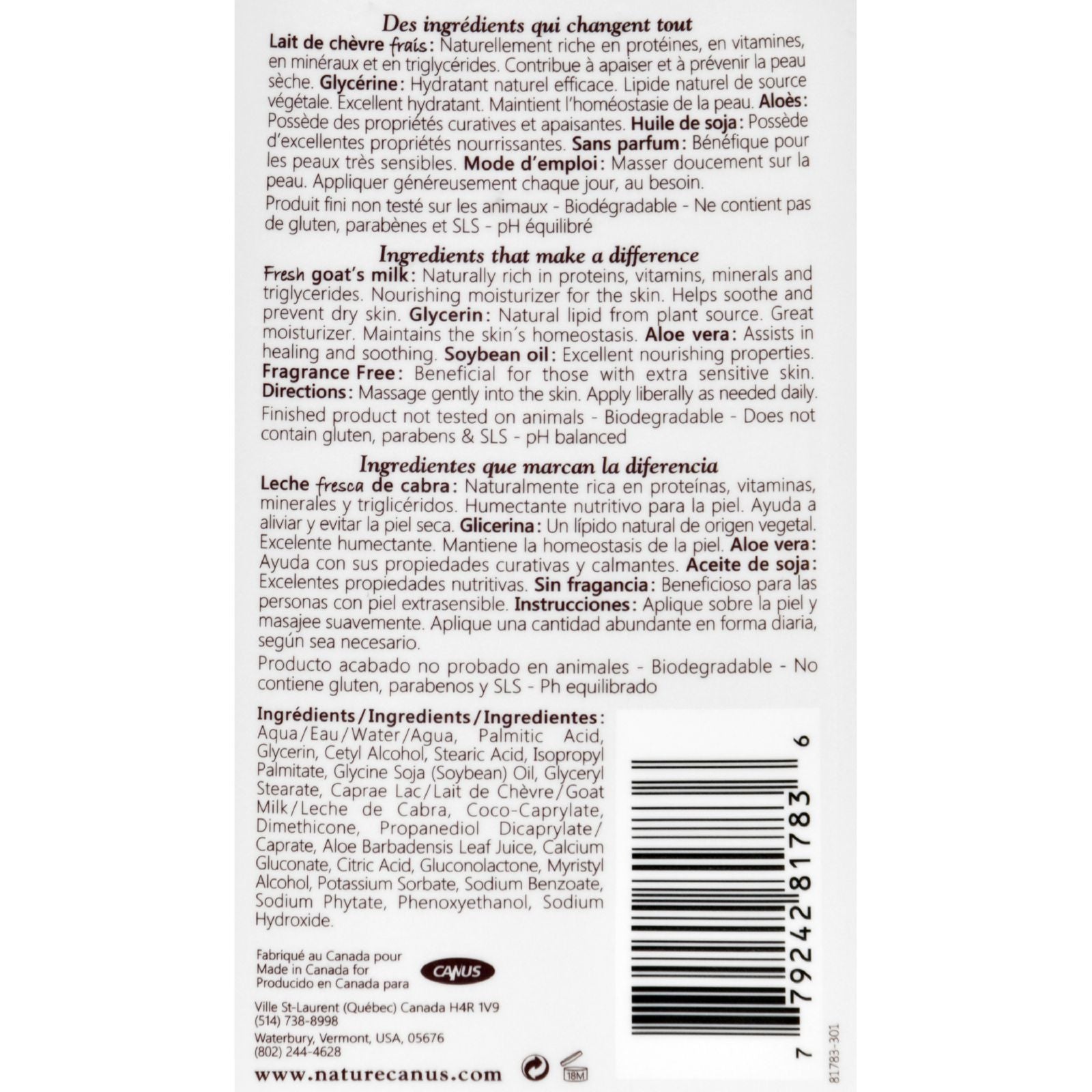 NATURE BY CANUS MOISTURIZING LOTION WITH FRESH GOAT'S MILK TAKES A BACK-TO-NATURE APPROACH TO MOISTURIZING YOUR SKIN. OUR LOTION IS MADE WITH FRESH COW'S MILK, WHICH IS RICH IN PROTEINS, VITAMINS AND MINERALS TO SOOTH DRY SKIN AND LEAVE IT SOFT AND SUPPLE. WE ENRICH OUR LOTION WITH PLANT-SOURCED GLYCERIN TO MAINTAIN SKIN'S HOMEOSTASIS, ALOE VERA TO HEAL AND SOOTH AND SOYBEAN OIL TO LEAVE SKIN SOFT AND MOISTURIZED. THIS 11.8 OZ. BOTTLE OF LOTION IS FRAGRANCE FREE.