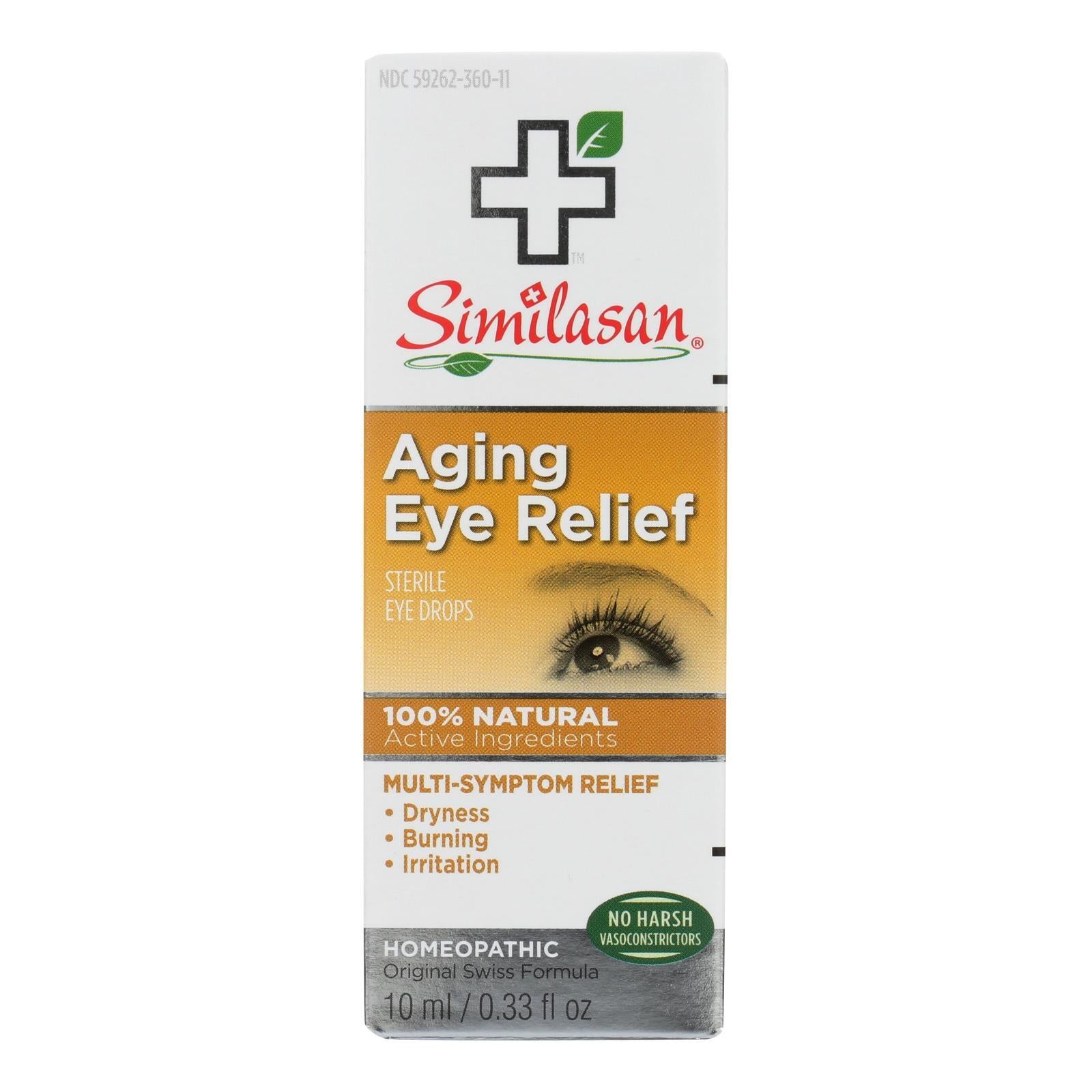 SIMILASAN AGING EYE RELIEF STERILE EYE DROPS ARE A MULTI-SYMPTOM HOMEOPATHIC REMEDY FOR EYE DRYNESS, BURNING AND IRRITATION. EACH 10 ML. BOX OF OUR AGING EYE RELIEF STERILE EYE DROPS IS MADE WITH 100% ACTIVE INGREDIENTS AND DOES NOT CONTAIN HARSH VASOCONSTRICTORS. THIS PRODUCT IS MADE USING OUR ORIGINAL SWISS FORMULA.